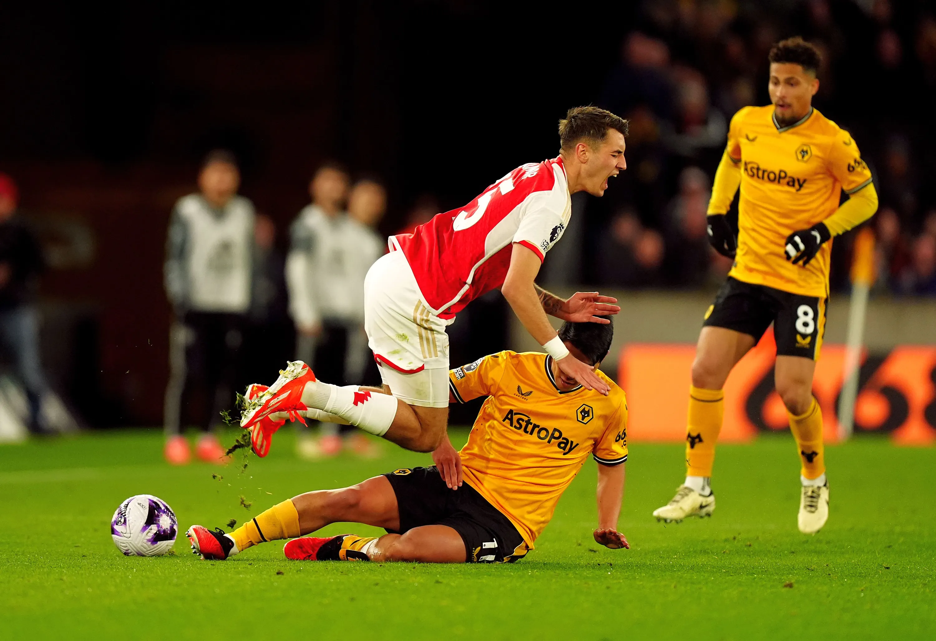 Wolverhampton Wanderers' Hwang Hee-Chan fouls Arsenal's Jakub Kiwior during the Premier League match at Molineux Stadium, Wolverhampton on Saturday, April 20, 2024. (Photo by Mike Egerton/PA Images via Getty Images)
