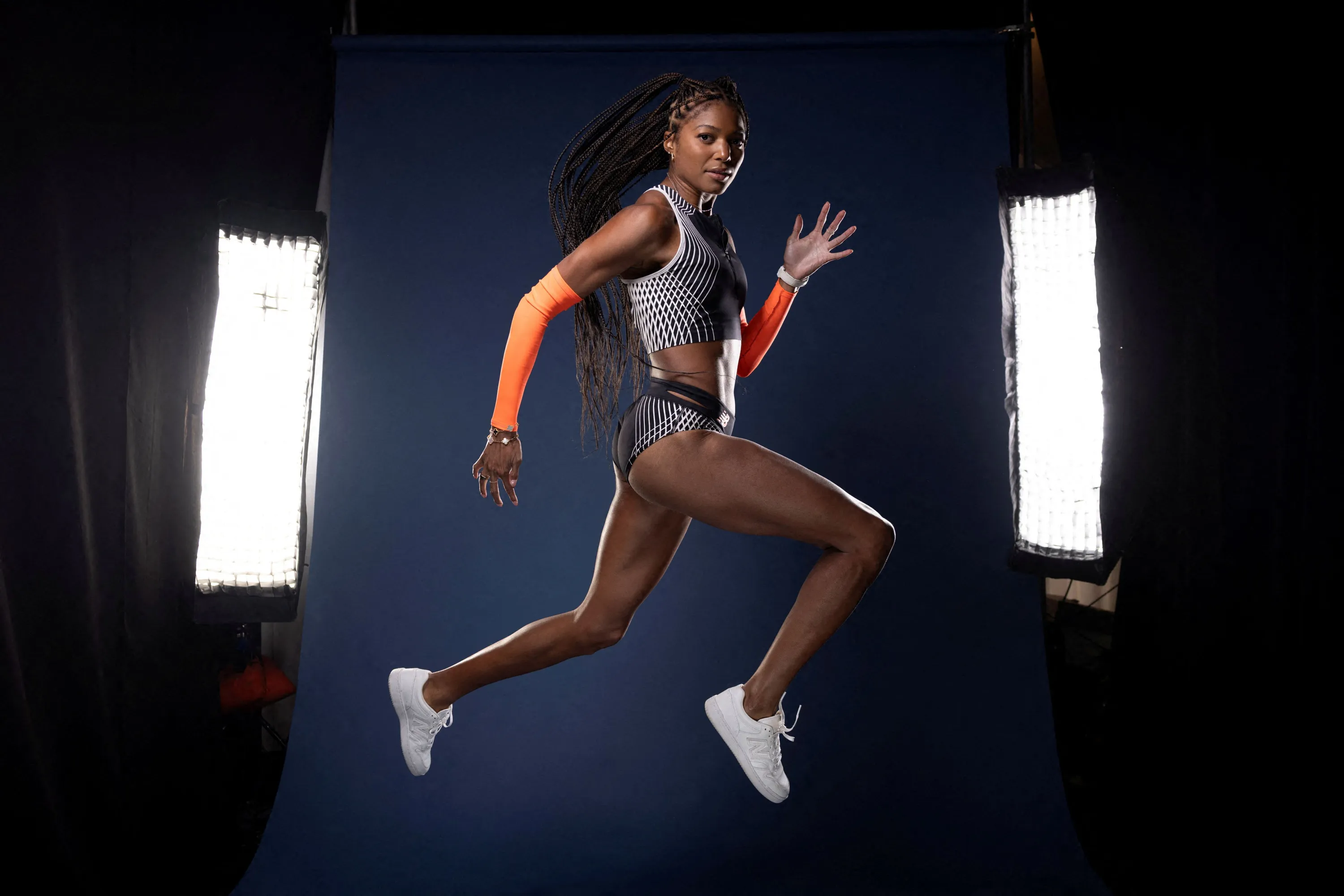 American track and field athlete Gabby Thomas poses for a portrait during the Team USA media summit ahead of the Paris Olympics and Paralympics, at an event in New York on April 16, 2024. (Photo by Andrew Kelly/Reuters)