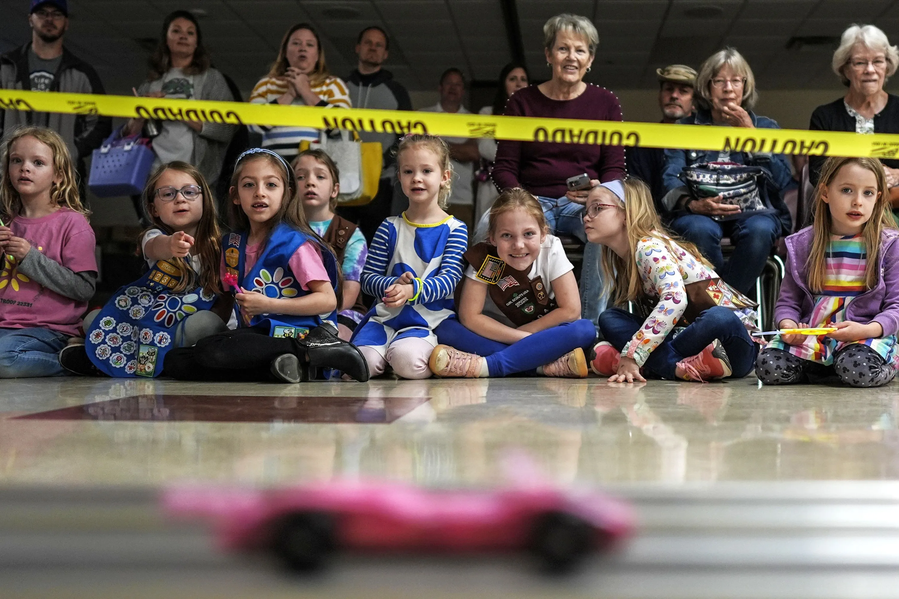 Girl Scout Daisys watch a car race during the Girl Scouts Pinewood Derby, Saturday, April 13, 2024, in Marietta, Ga. (Photo by Mike Stewart/AP Photo)
