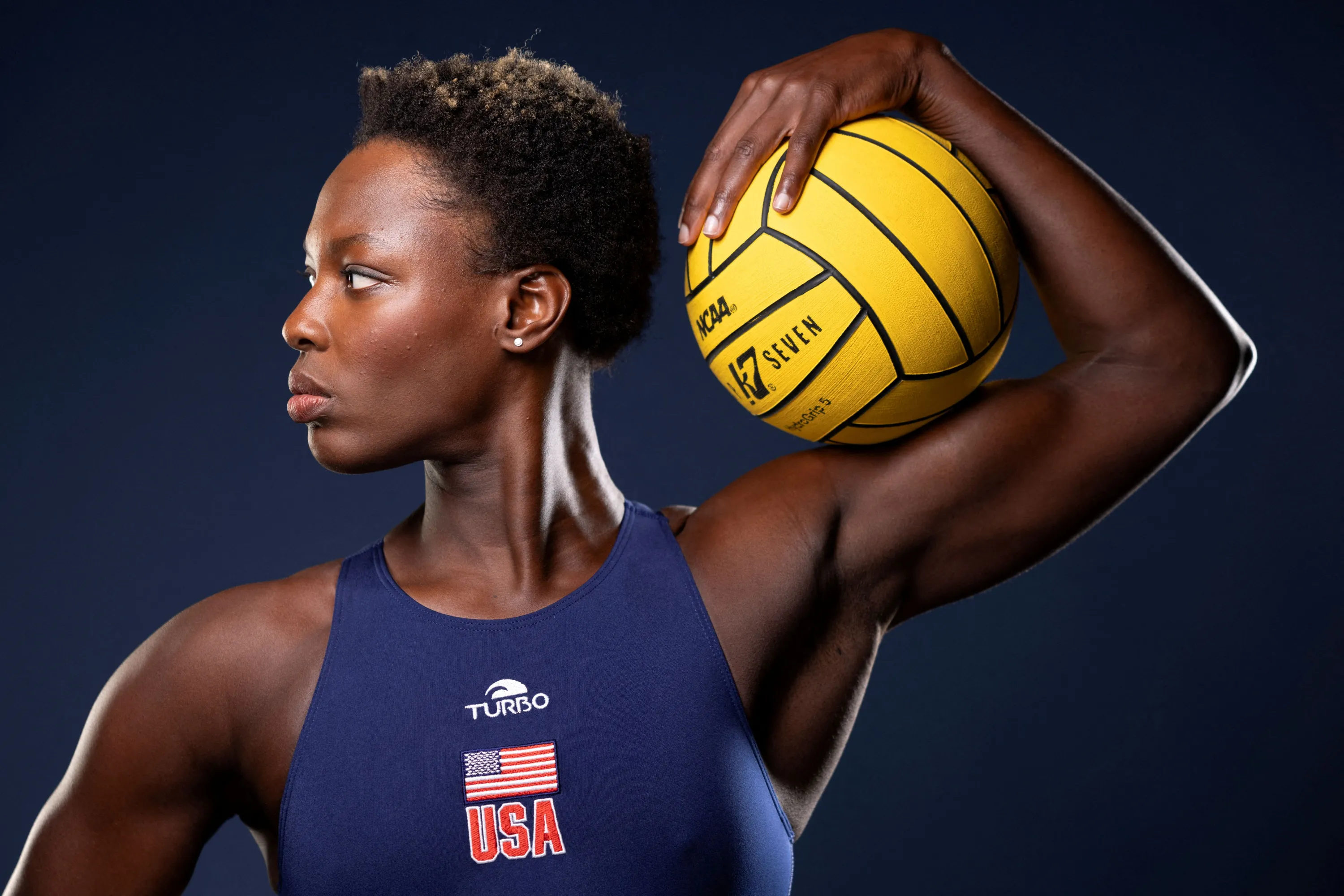 American water polo player Ashleigh Johnson poses for a portrait during the Team USA media summit ahead of the Paris Olympics and Paralympics, at an event in New York on April 16, 2024. (Photo by Andrew Kelly/Reuters)