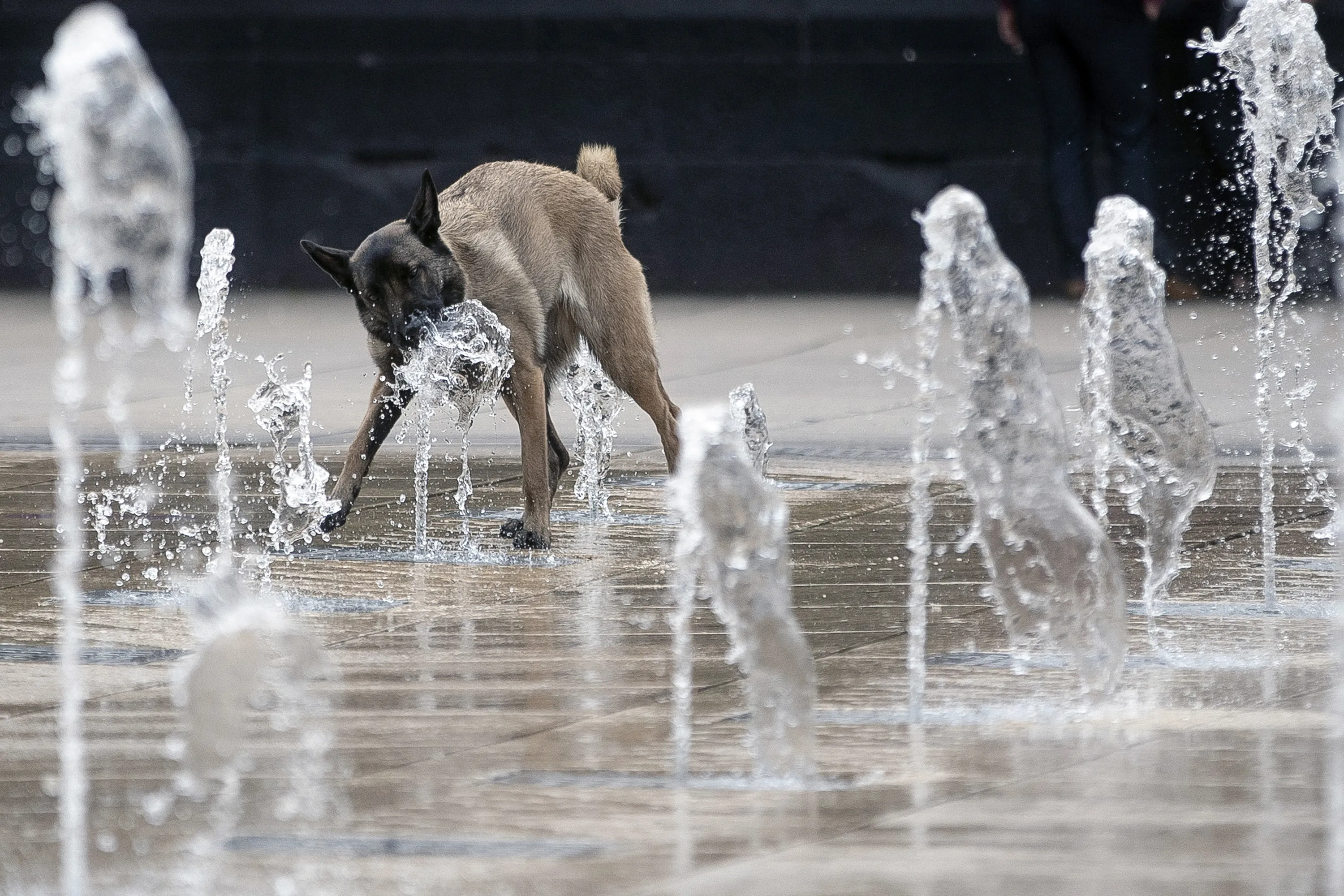 A dog drinks water from a fountain on the esplanade of the Revolution Monument in Mexico City, Mexico, 18 April 2024. Authorities from the Institute of Atmospheric Sciences and Climate Change of the National Autonomous University of Mexico (UNAM) emphasized that the elderly and children are the population groups most vulnerable to rising temperatures, calling on people to take the necessary measures to prevent heat stroke. (Photo by Isaac Esquivel/EPA)
