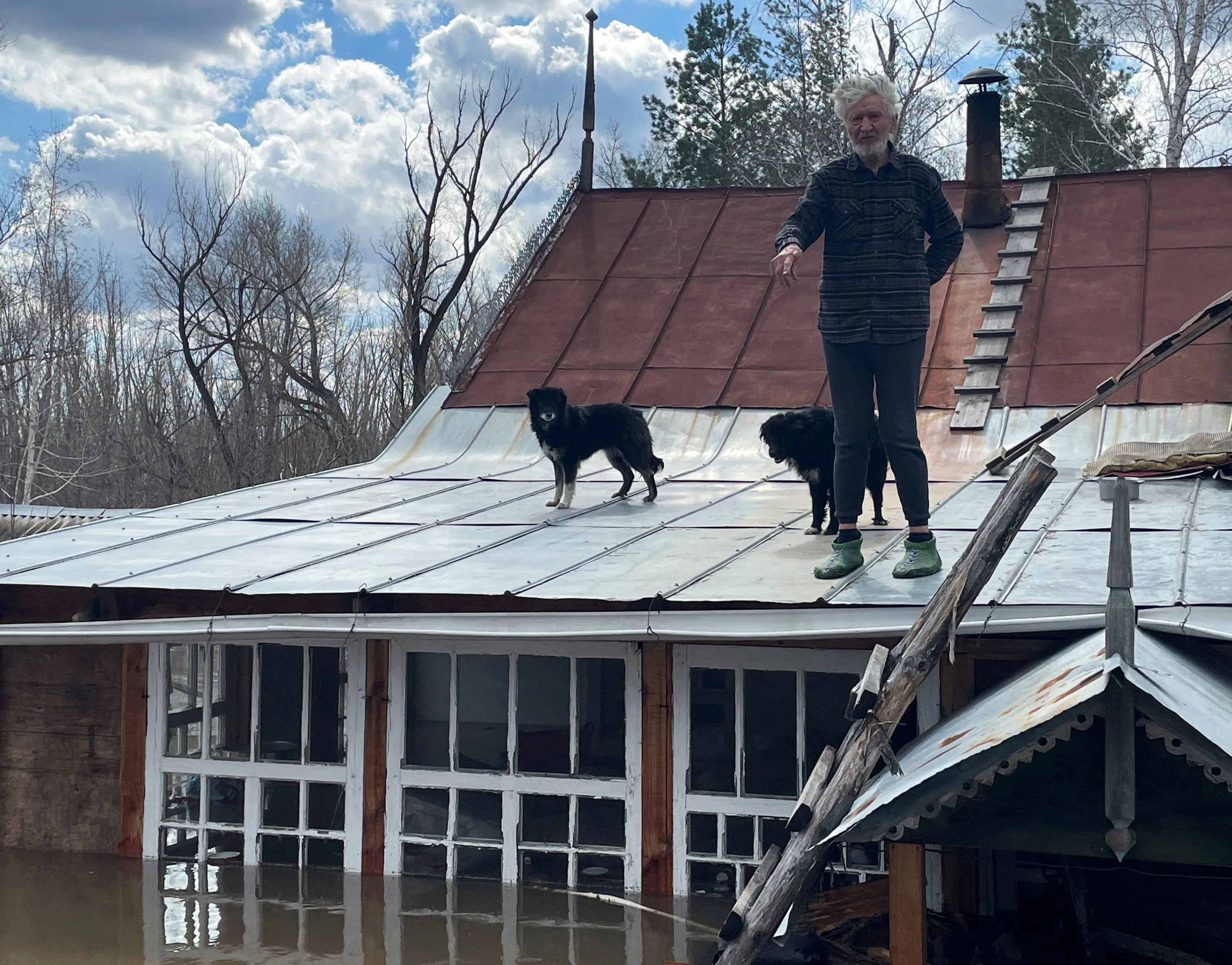 Artist Nikolai Kryuchkov stands on the roof of his flooded house in Orenburg, Russia, on April 13, 2024. (Photo by Alexander Reshetnikov/Reuters)