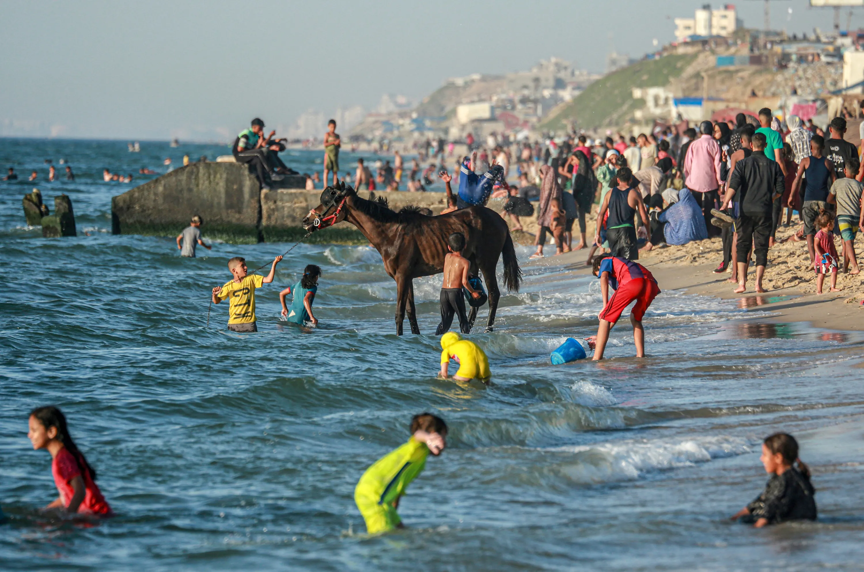 Palestinians enjoy the beach in Deir el-Balah in the central Gaza Strip on April 17, 2024, amid the ongoing conflict between Israel and the militant group Hamas. (Photo by AFP Photo)