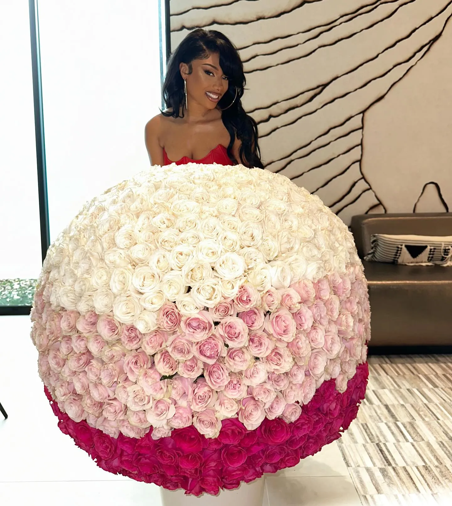 American rapper Megan Thee Stallion in the first decade of April 2024 receives an enormous bouquet of flowers. (Photo by theestallion/Instagram)