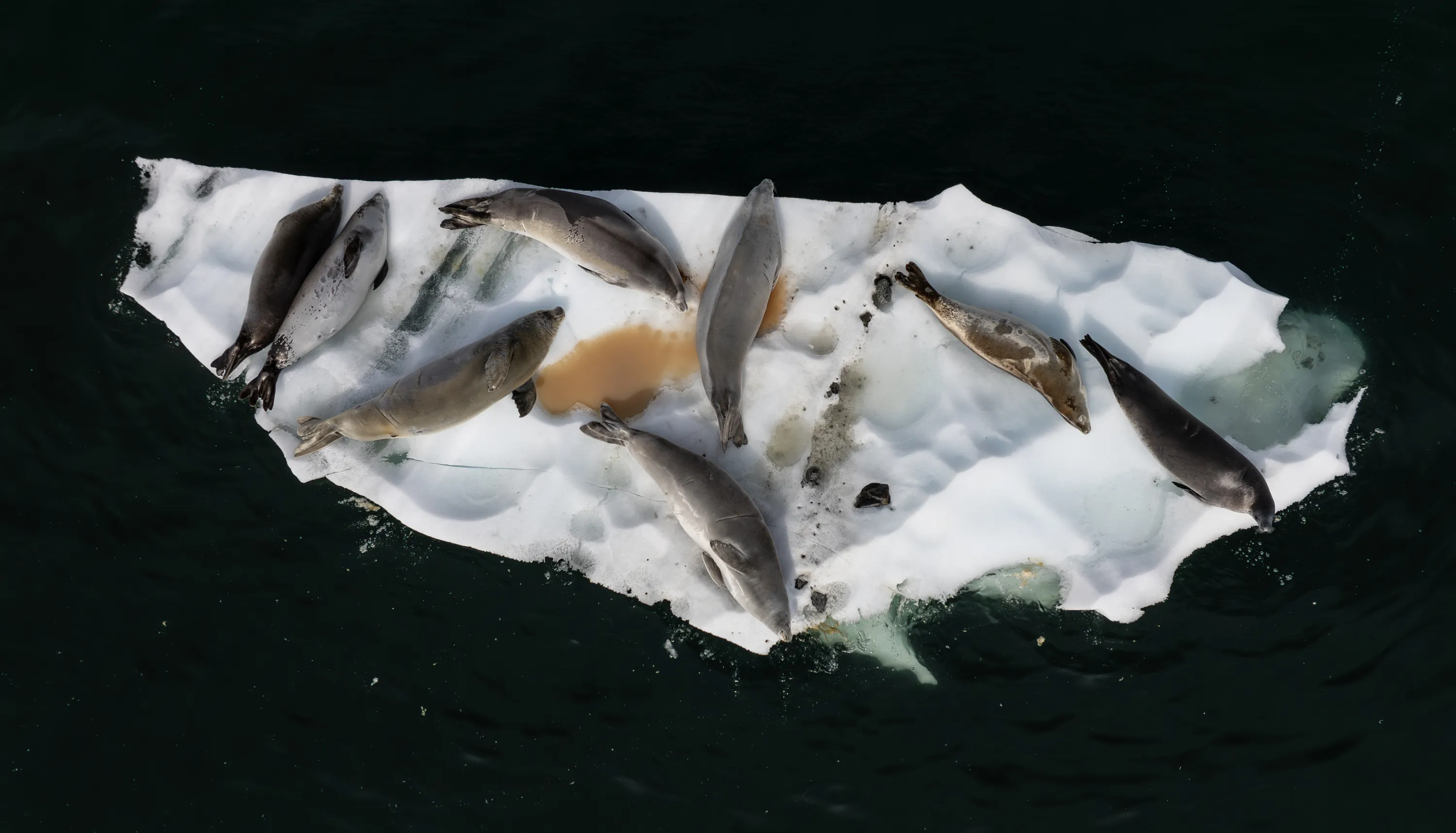 An aerial view of seals resting on an ice mass as Turkish scientists conduct a protection for the southern polar creatures, which are heavily affected by the consequences of global climate change, with the rules and observations they apply in their work in Antarctica on April 11, 2024. (Photo by Sebnem Coskun/Anadolu via Getty Images)