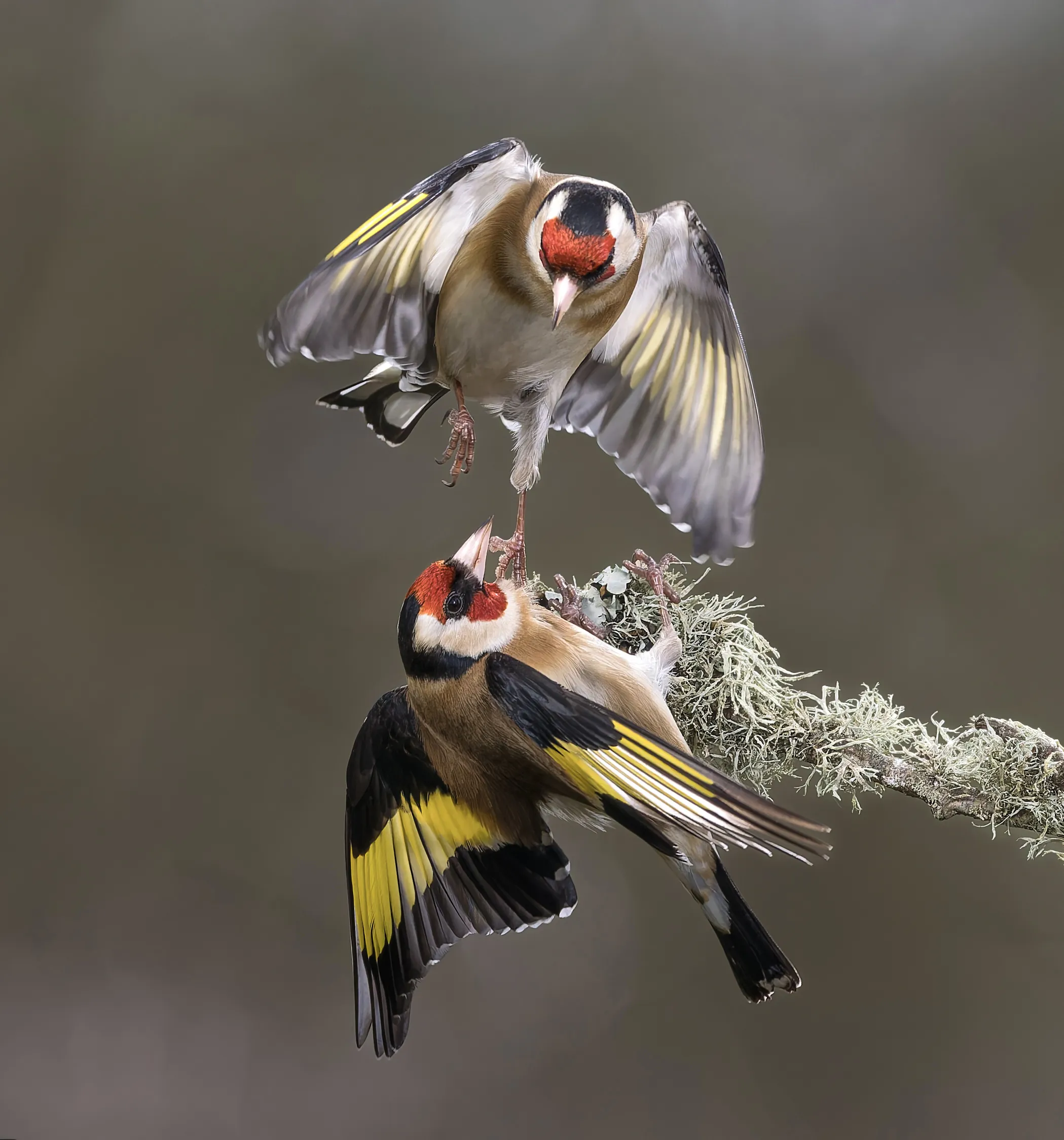 Goldfinch v Goldfinch. Mid air battles between garden birds captured by Lee O'Dwyer in his garden in Lytham, Lancs in the second decade of April 2024. (Photo by Animal News Agency)
