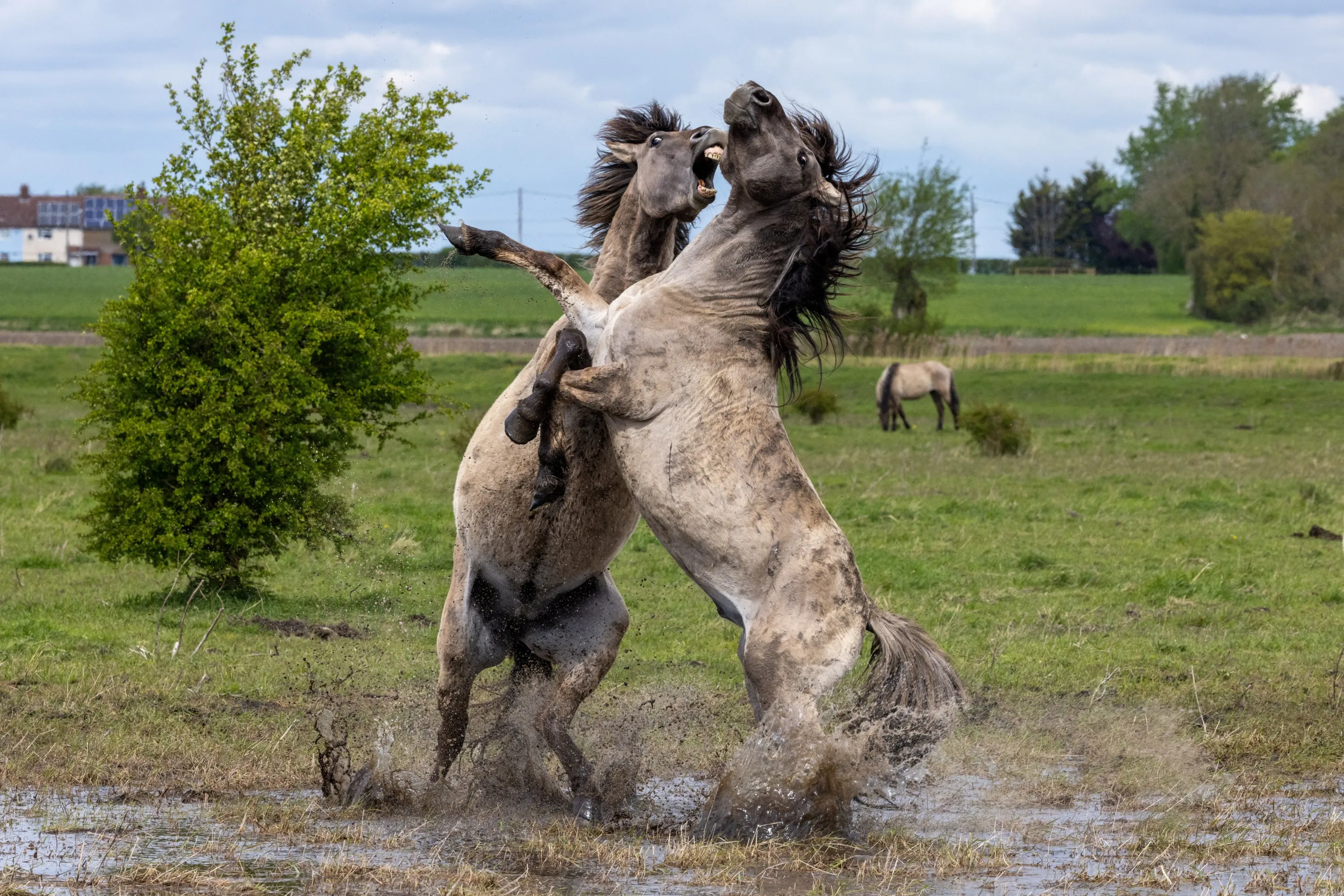 Two rival konik stallions battle for dominance in the second decade of April 2024 on the wetlands of Wicken Fen in Cambridgeshire, UK where they have been introduced to encourage biodiversity. (Photo by Bav Media)