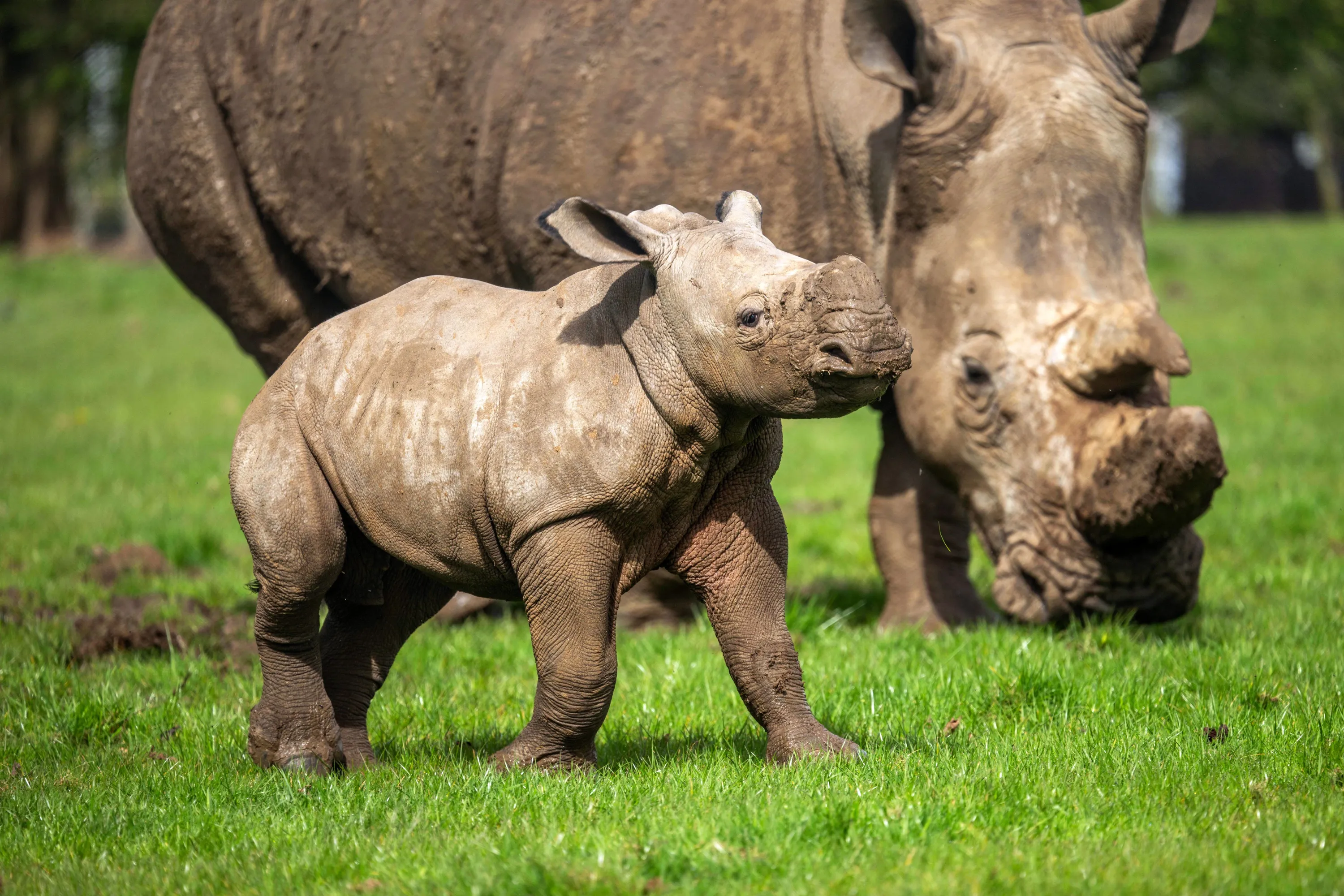 Benja, a southern white rhino, enjoys the sun with his mother, Jaseera, at Whipsnade Zoo in Bedfordshire, UK in the second decade of April 2024. Benja was born last month weighing 45kg and is Jaseera’s first calf. There are 10,000 mature southern white rhinos left in the wild, with numbers continuing to fall. (Photo by Whipsnade Zoo)