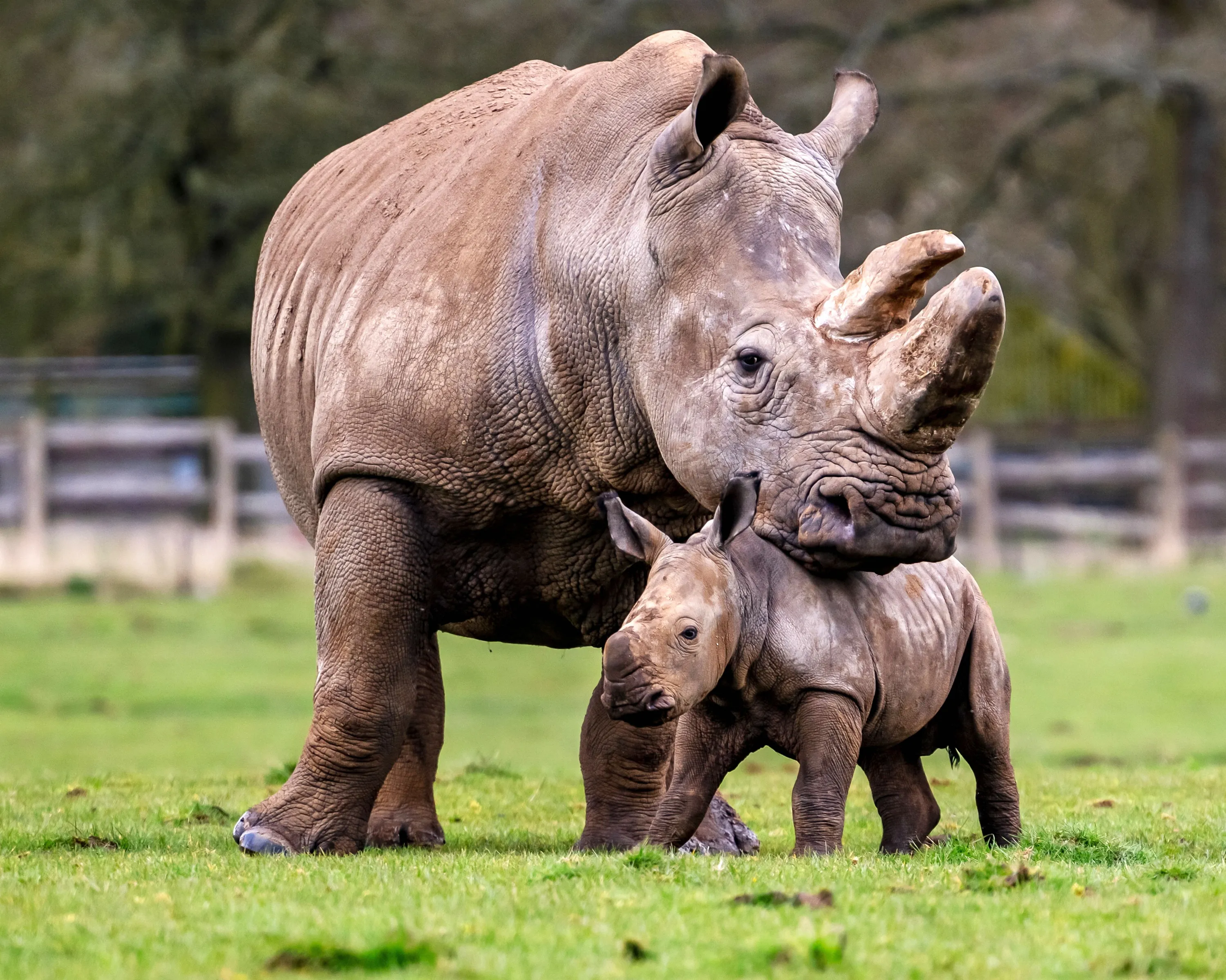 A southern white rhino calf named Benja playing in the sun while his mother Jaseera watches on in Whipsnade Zoo, England on April 24, 2024. An endangered baby rhino has well and truly found its feet after being filmed playing and exploring its new paddock – six weeks after being born. (Photo by South West News Service)