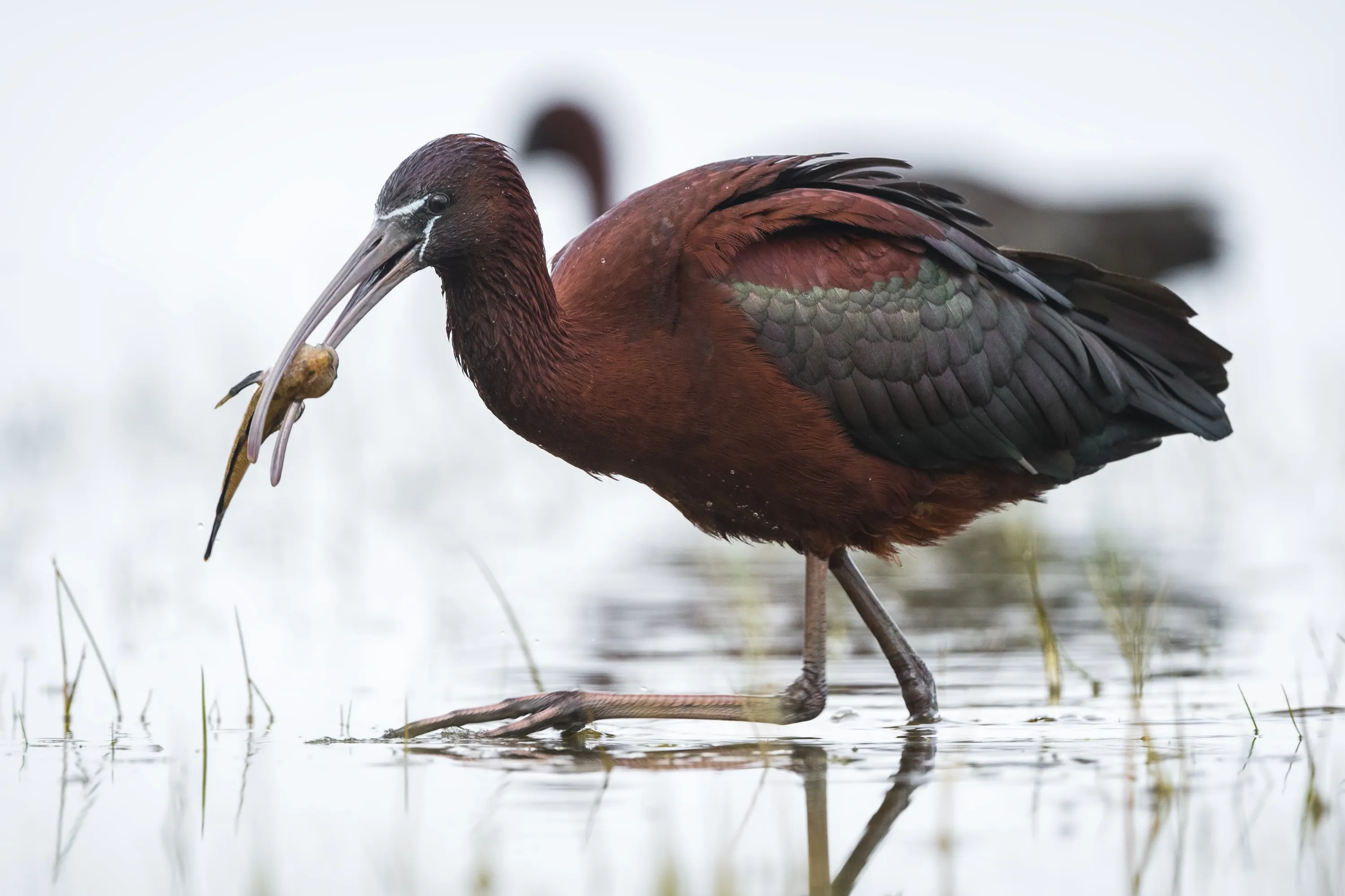 A Glossy ibis (Plegadis falcinellus) is seen feeding on the shore of Lake Uluabat during spring season in Bursa, Turkiye on April 09, 2024. These birds, which prefer wetlands for feeding and nesting, are characterized by their long, curved beak and dark-colored feathers. (Photo by Alper Tuydes/Anadolu via Getty Images)
