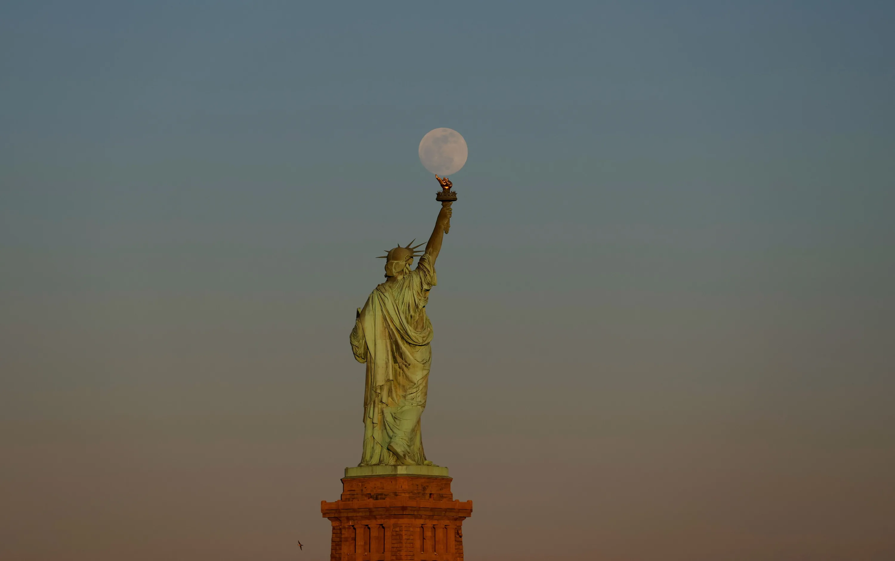 The Pink Moon, illuminated at 99 percent, rises behind the Statue of Liberty as the sun sets in New York City on April 22, 2024, as seen from Jersey City, New Jersey. (Photo by Gary Hershorn/Getty Images)