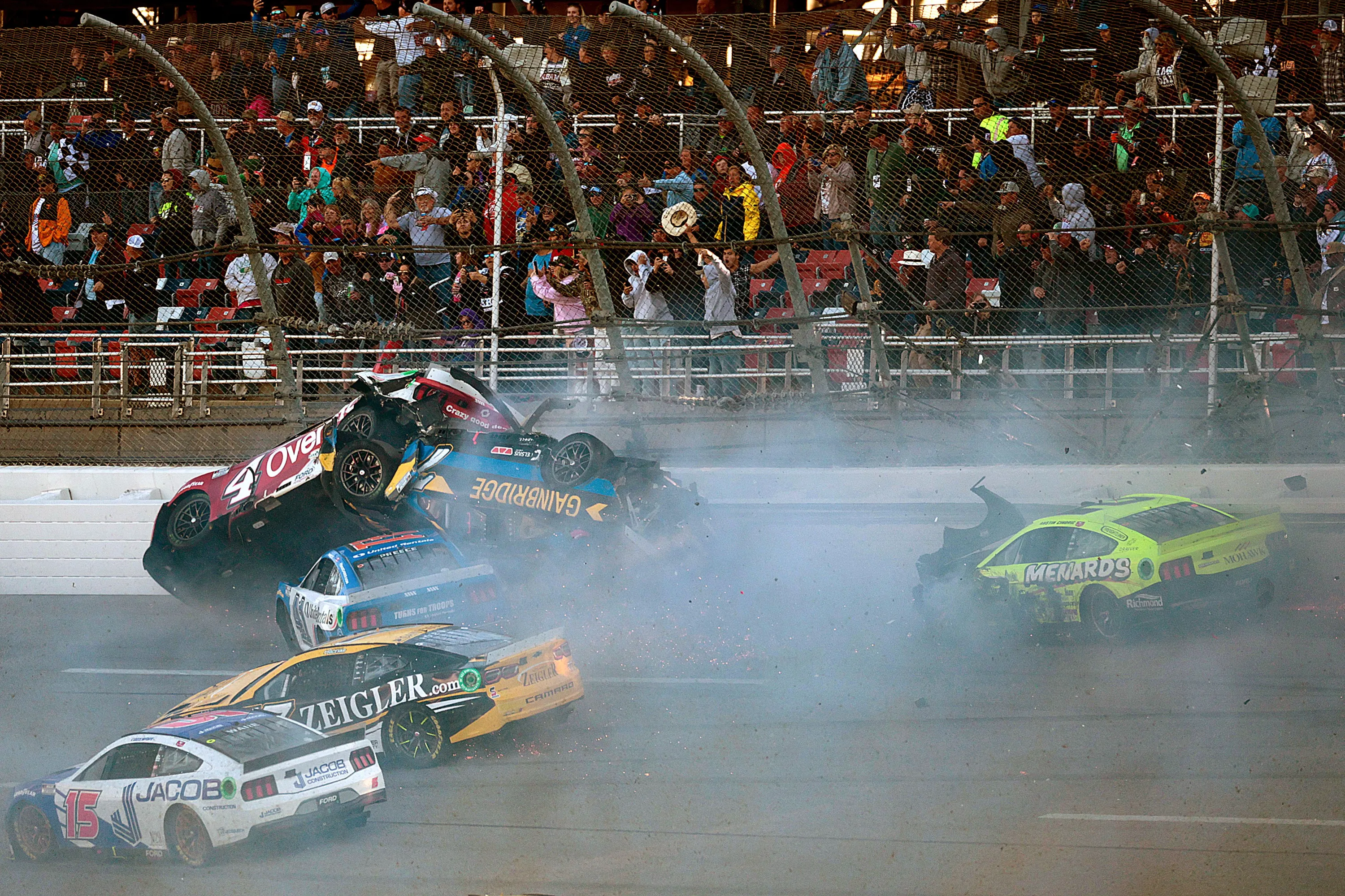 Josh Berry, driver of the #4 Overstock.com Ford, Ryan Preece, driver of the #41 United Rentals Ford, Corey LaJoie, driver of the #7 Gainbridge Chevrolet, and Austin Cindric, driver of the #2 Menards/RichmndWtrHeatrs Ford, spin into the wall after an on-track incident on the final lap of the NASCAR Cup Series GEICO 500 at Talladega Superspeedway on April 21, 2024 in Talladega, Alabama. (Photo by James Gilbert/Getty Images)