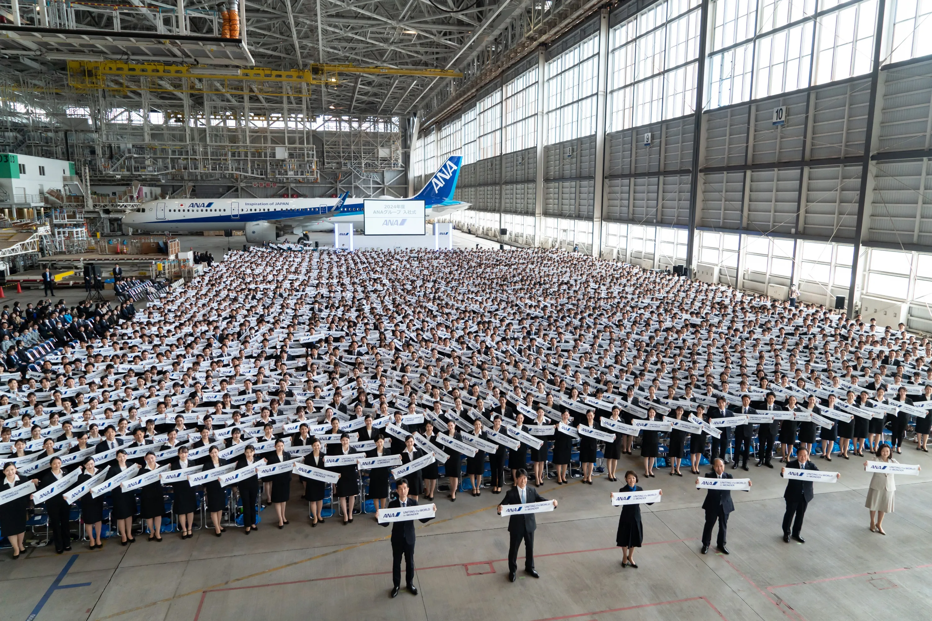 Newly-hired employees hold banners as they pose for a group photograph during the entrance ceremony for ANA Group in an airplane hangar at Haneda Airport on April 01, 2024 in Tokyo, Japan. (Photo by Tomohiro Ohsumi/Getty Images)