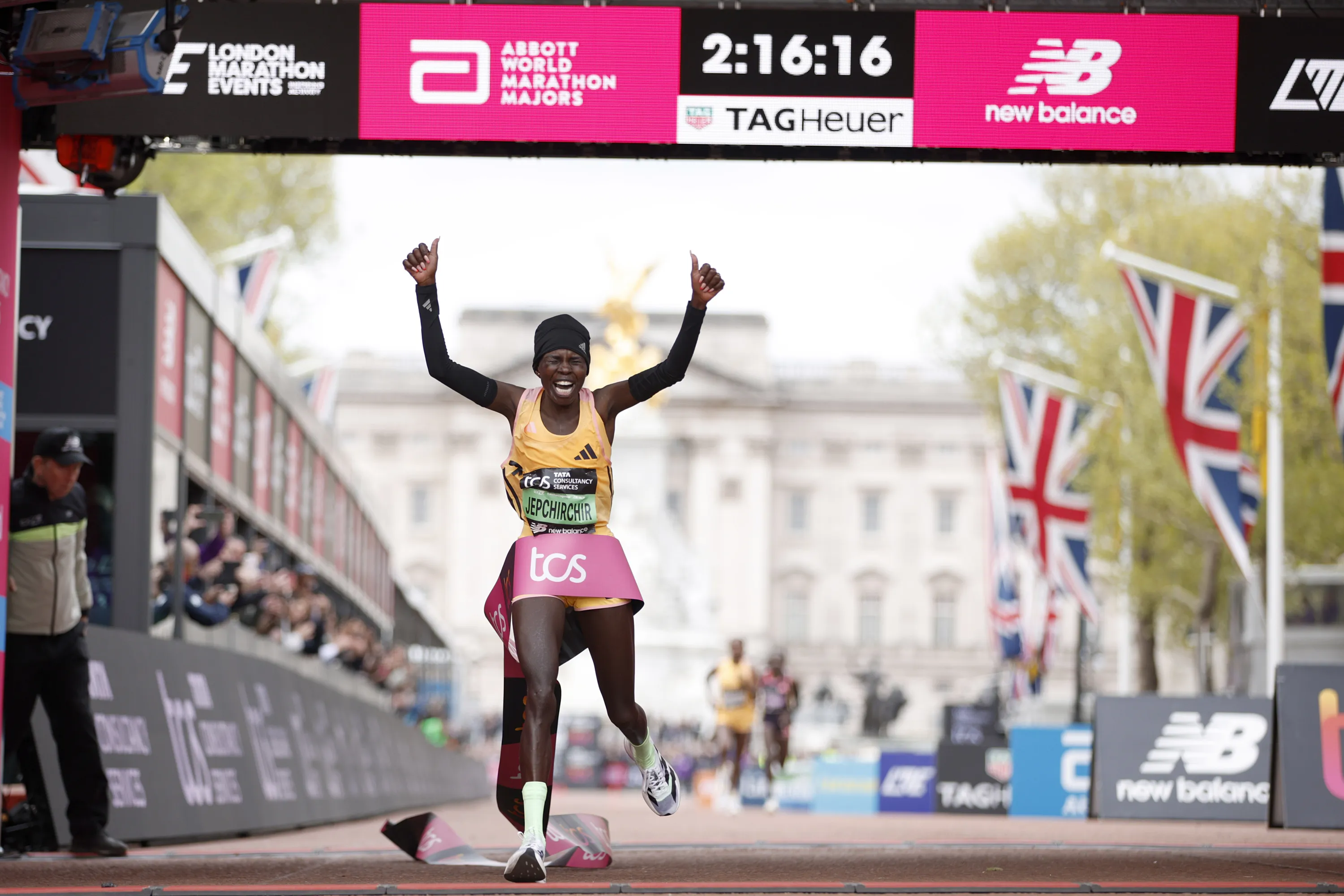Peres Jepchirchir of Kenya crosses the finish line to win the women's race at the London Marathon in London, Sunday, April 21, 2024. (Photo byDavid Cliff/AP Photo)