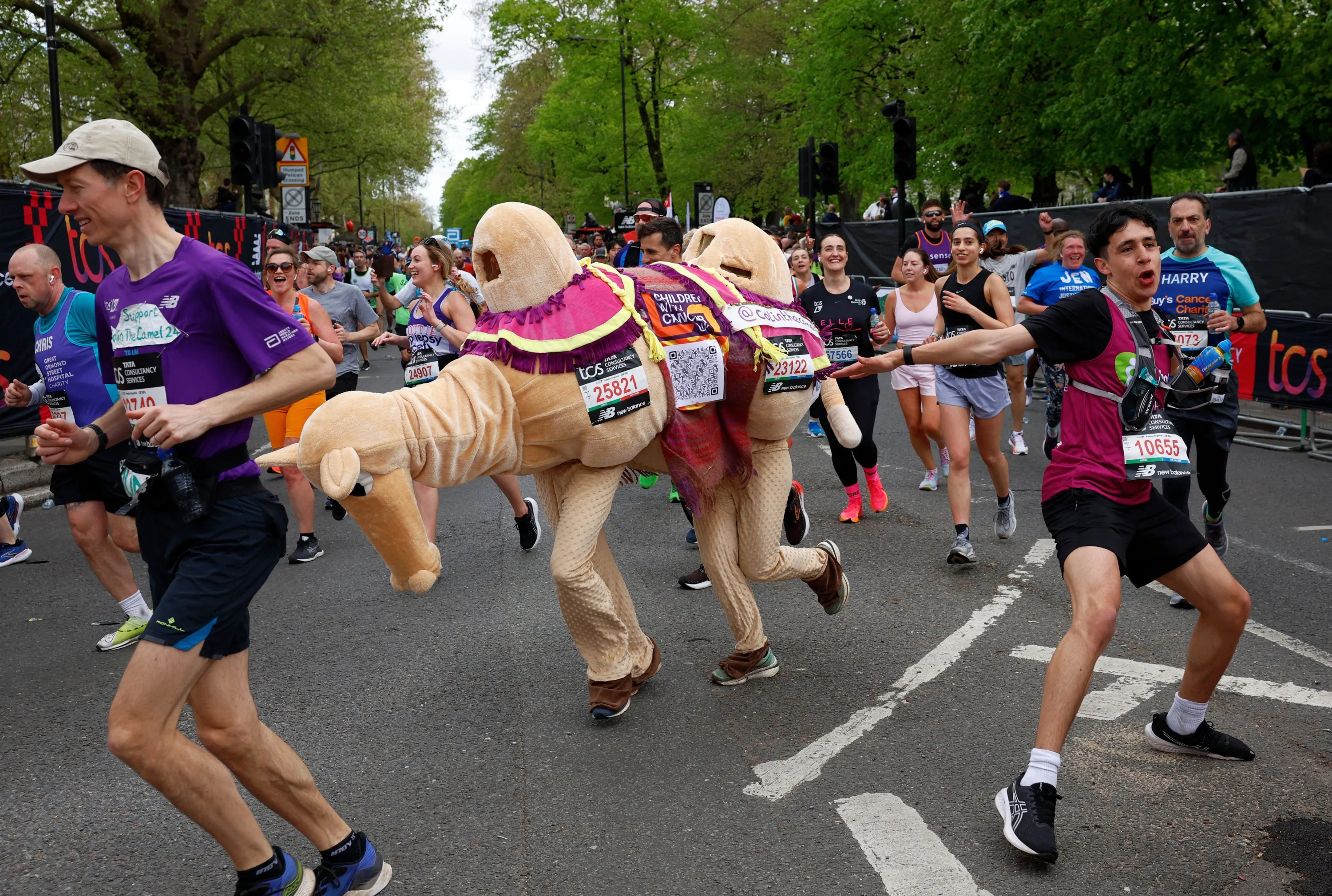 Tom and Becky Raftery got over the hump, completing the race dressed as a camel at London Marathon in London, Britain on April 21, 2024. (Photo by John Sibley/Reuters)