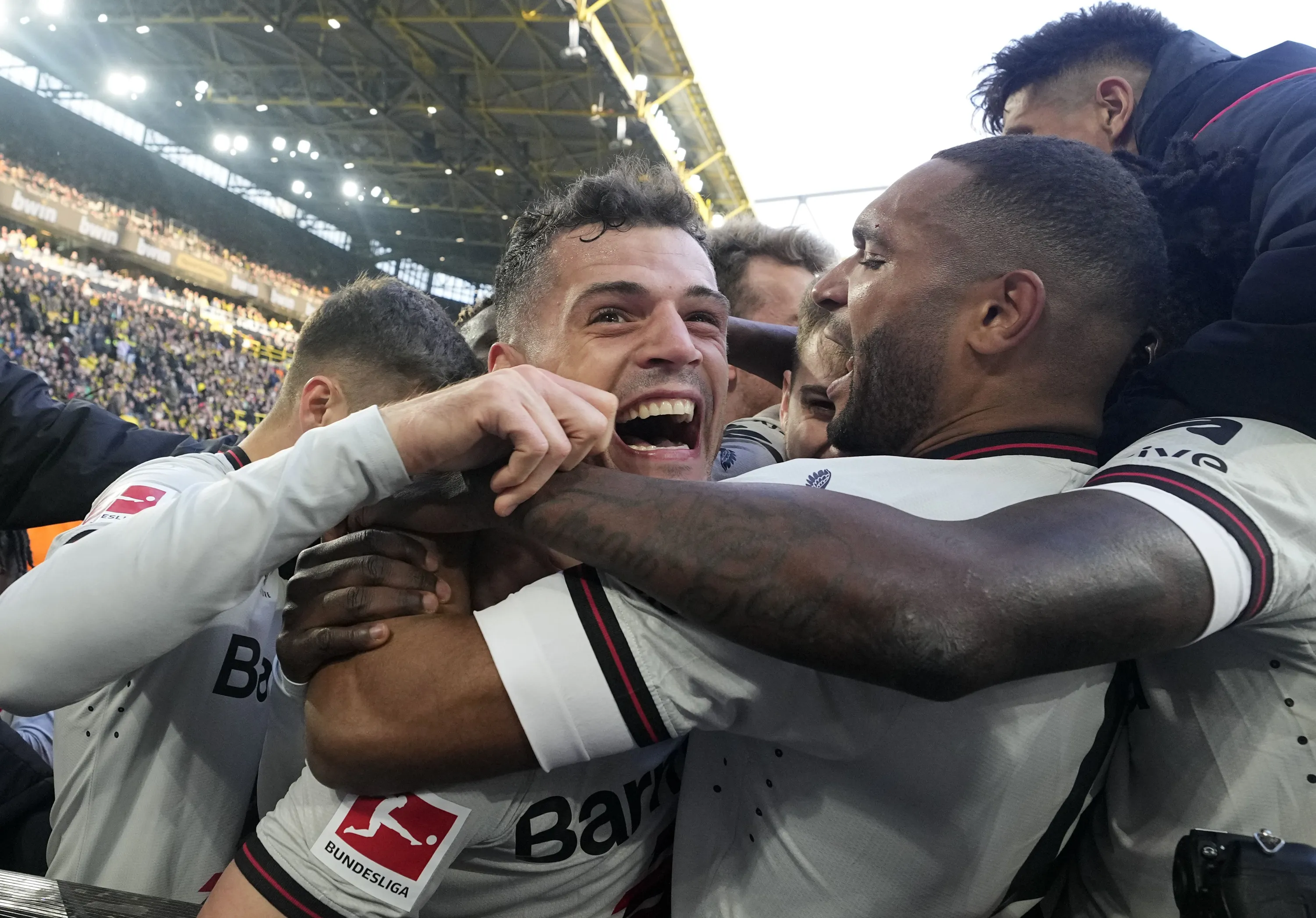 Leverkusen's Granit Xhaka, left, is embraced by Jonathan Tah as the team celebrates after Josip Stanisic scored in the last minute during the German Bundesliga soccer match between Borussia Dortmund and Bayer Leverkusen in Dortmund, Germany, Sunday, April 21, 2024. The match ended 1-1, Leverkusen is unbeaten since a record of 45 matches. (Photo by Martin Meissner/AP Photo)