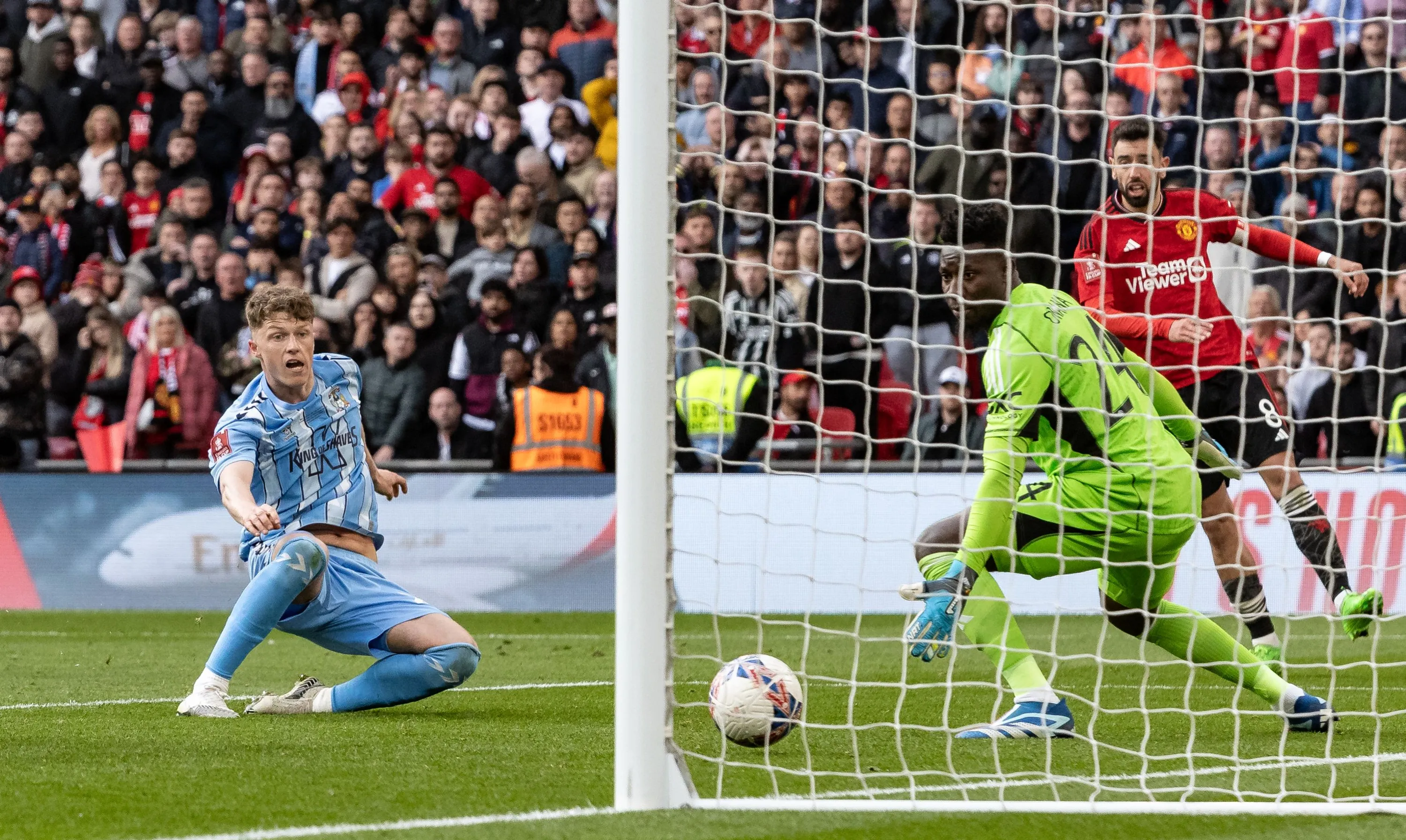 Manchester United's Andre Onana is beaten by Coventry City's Victor Torp but his effort was ruled out for offside by VAR during the Emirates FA Cup Semi Final match between Coventry City and Manchester United at Wembley Stadium on April 21, 2024 in London, England. (Photo by Andrew Kearns – CameraSport via Getty Images)