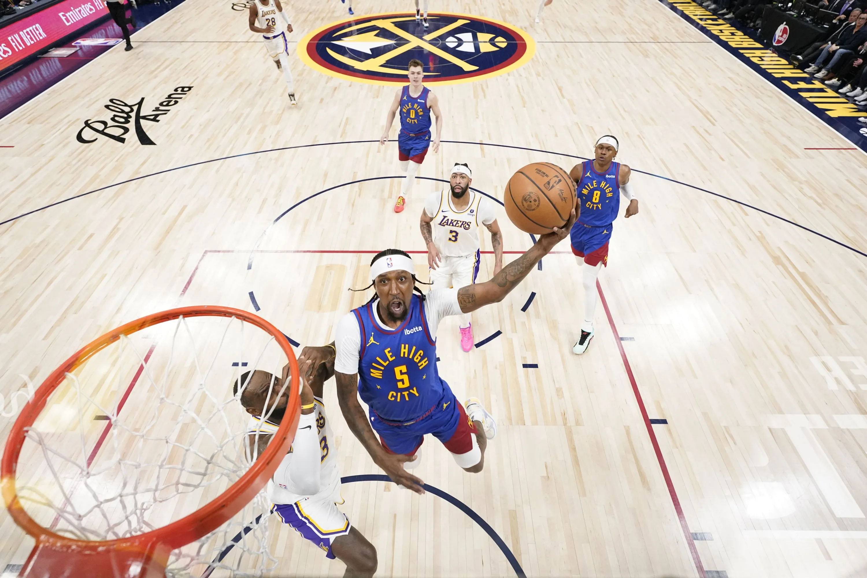 Denver Nuggets guard Kentavious Caldwell-Pope (5) goes up to shoot against Los Angeles Lakers forward LeBron James, left, during the first half in Game 1 of an NBA basketball first-round playoff series, Saturday, April 20, 2024, in Denver. (Photo by Jack Dempsey/AP Photo)