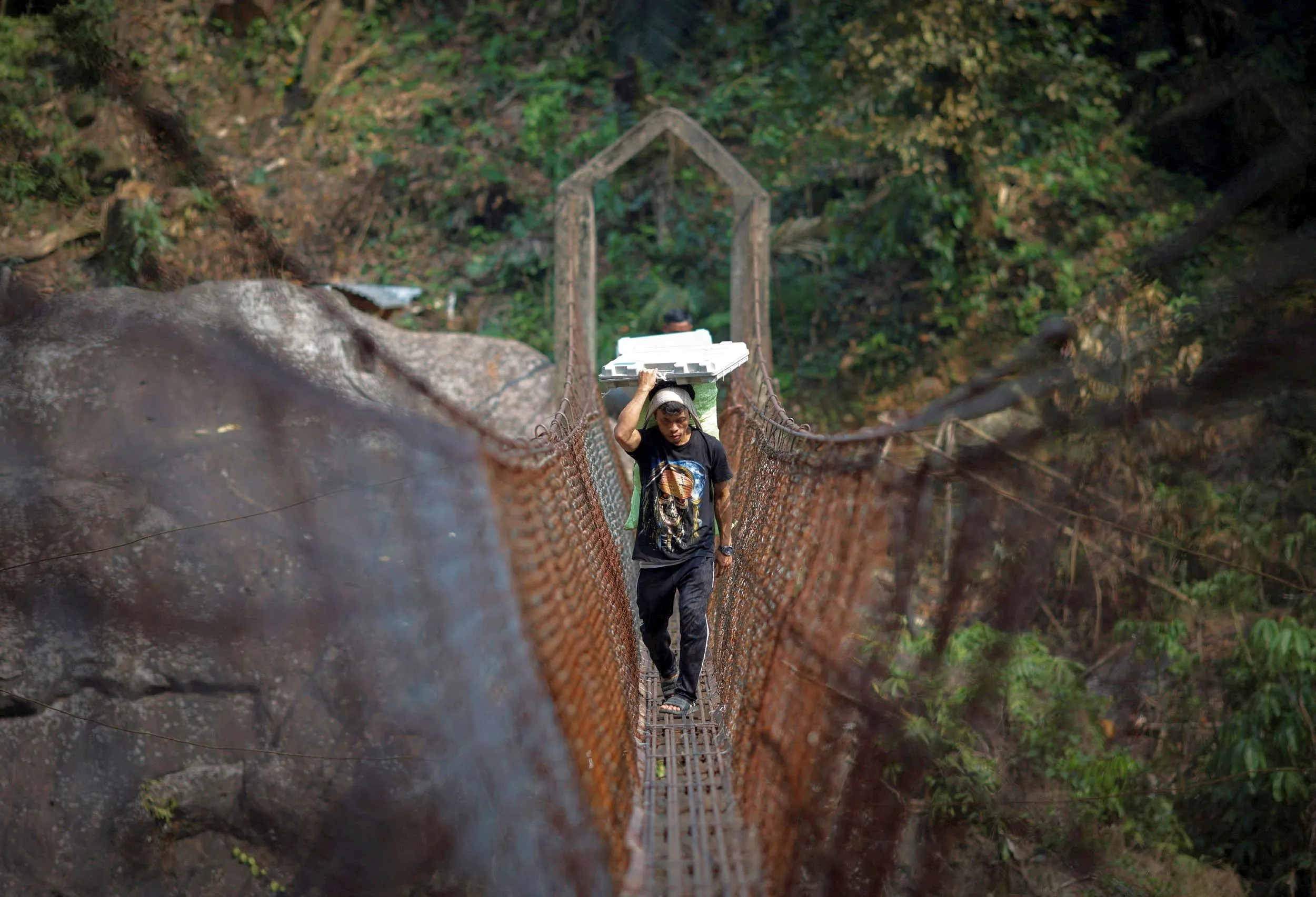 Cornelius Mawa, 28, a porter, carries Voter Verifiable Paper Audit Trail (VVPAT) and Electronic Voting Machines (EVM) as he crosses a suspension bridge to reach a remote polling station, ahead of the first phase of the election, in Shillong in the northeastern state of Meghalaya, India, on April 17, 2024. (Photo by Adnan Abidi/Reuters)