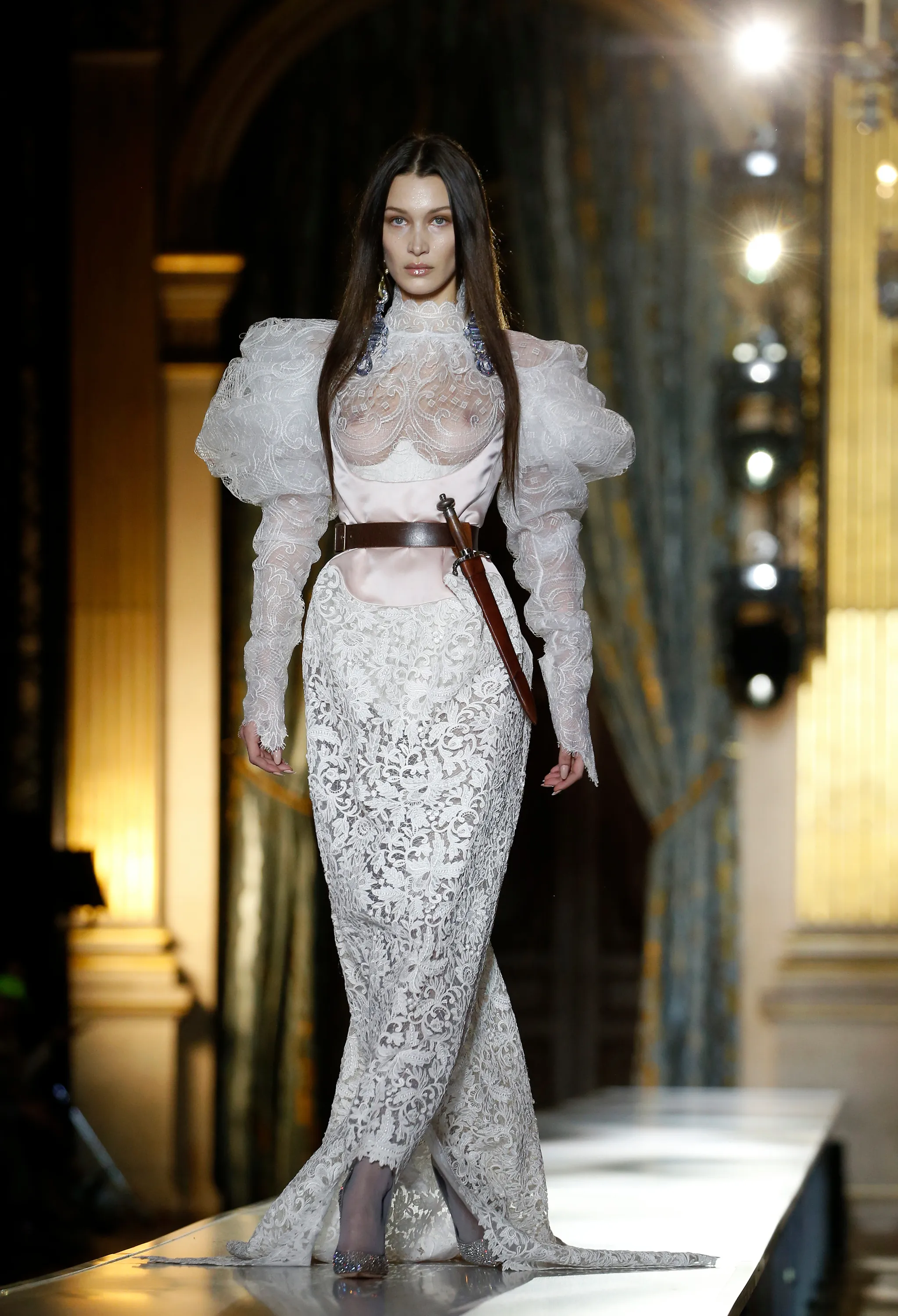 US model Bella Hadid model walks the runway during the Vivienne Westwood show as part of the Paris Fashion Week Womenswear Fall/Winter 2020/2021 on February 29, 2020 in Paris, France. (Photo by Thierry Chesnot/Getty Images)
