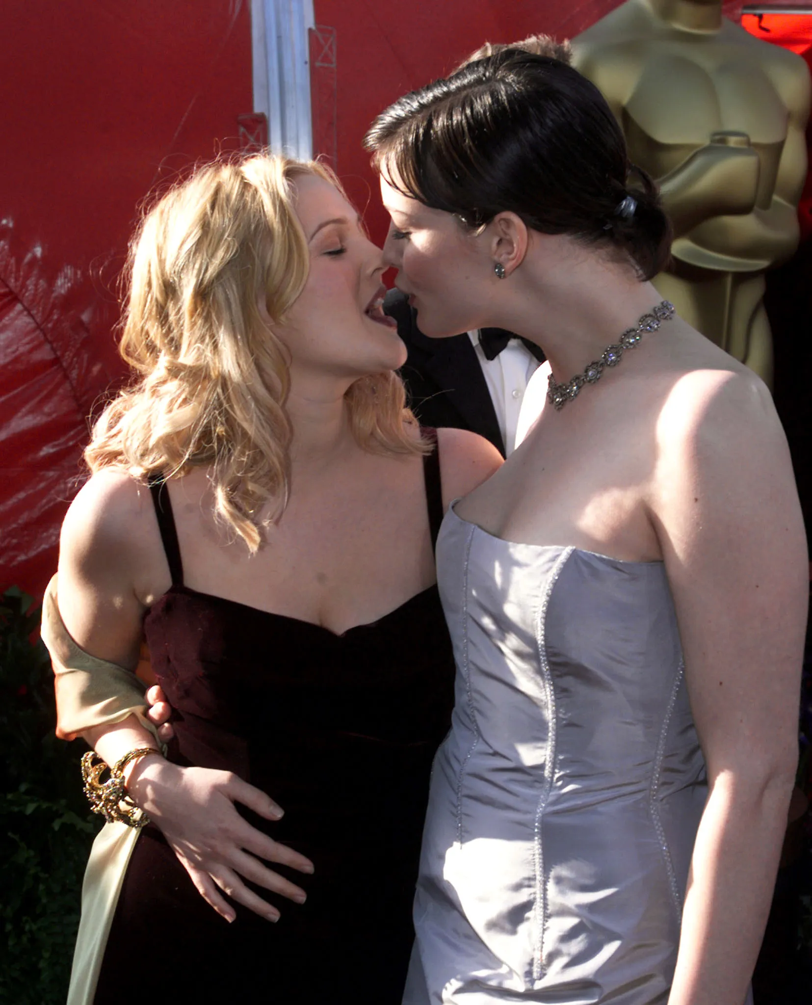 Actress Drew Barrymore kisses fellow actress Liv Tyler during the arrivals at the 71st Annual Academy awards at the Dorothy Chandler Pavilion in Los Angeles on March 21, 1999. (Photo by Fred Prouser/Gety Images)