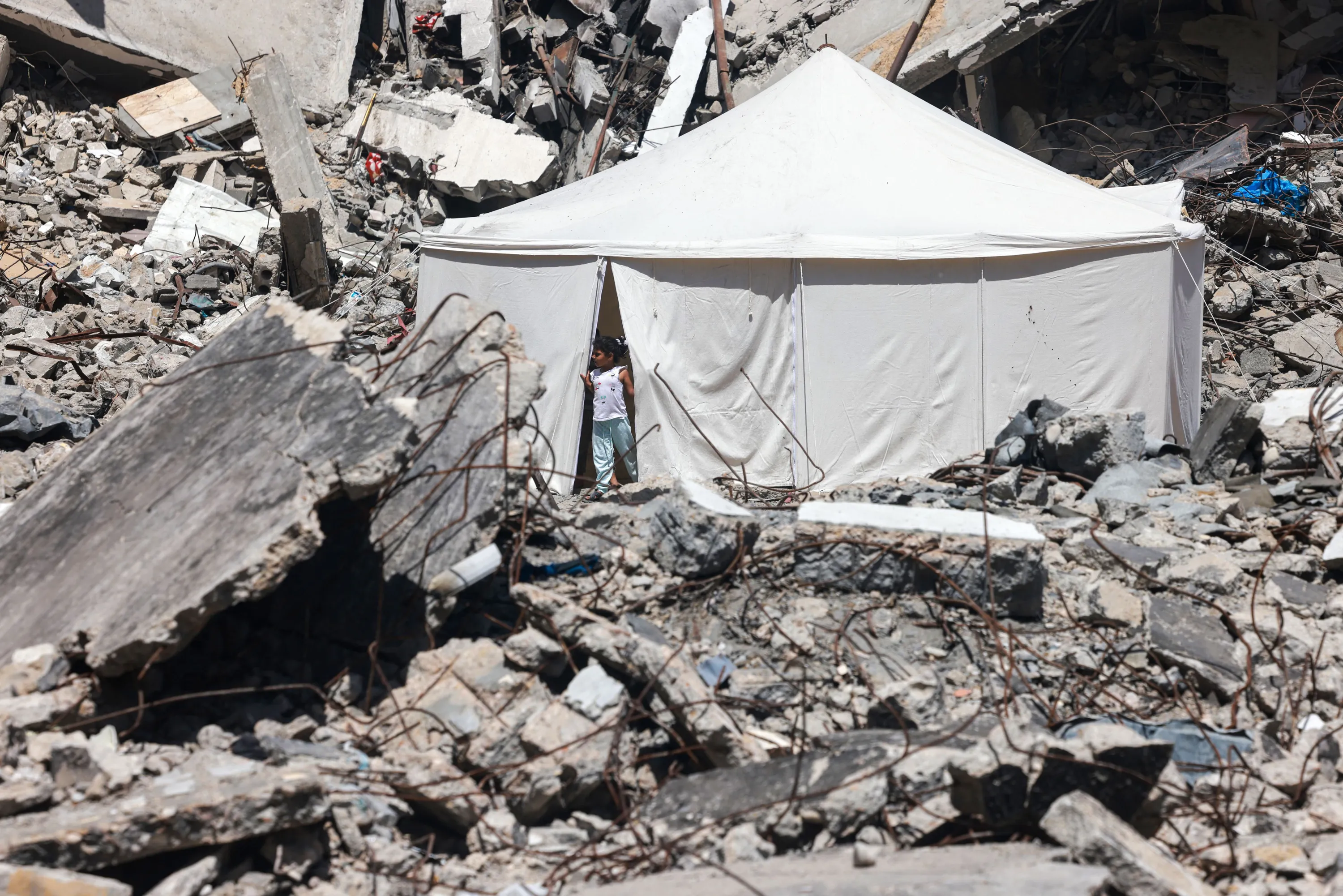 A displaced Palestinian stands at the entrance of a tent set up amid the rubble of a building damaged during Israeli bombardment in Rafah, on the southern Gaza Strip on April 19, 2924, amid ongoing battles between Israel and the militant Hamas group. (Photo by Mohammed Abed/AFP Photo)