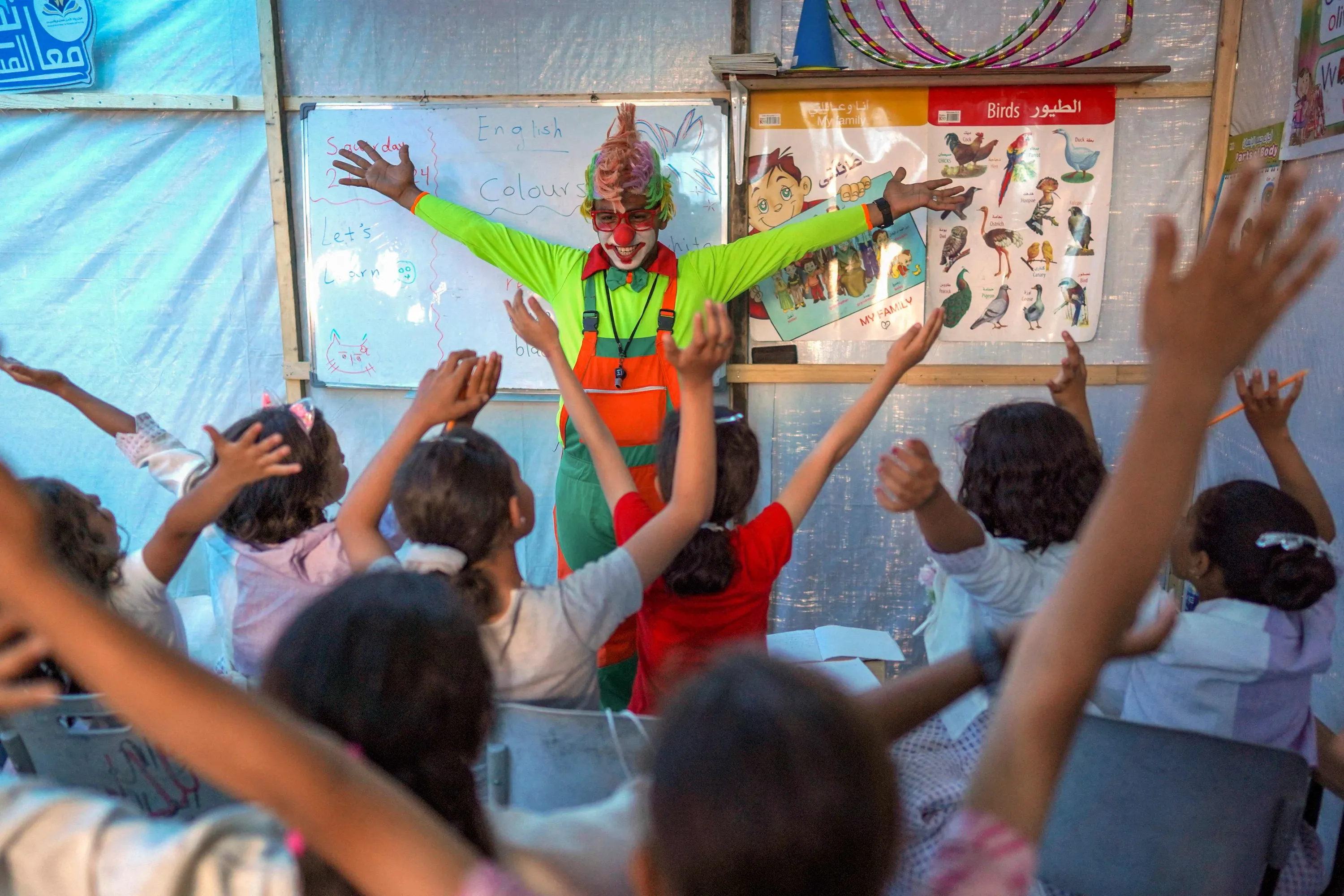 A man dressed as a clown entertains children at a makeshift school in a camp for displaced Palestinians in Deir El-Balah, in the central Gaza strip on April 27, 2024, amid the ongoing conflict between Israel and the militant Hamas group. (Photo by AFP Photo/Stringer)