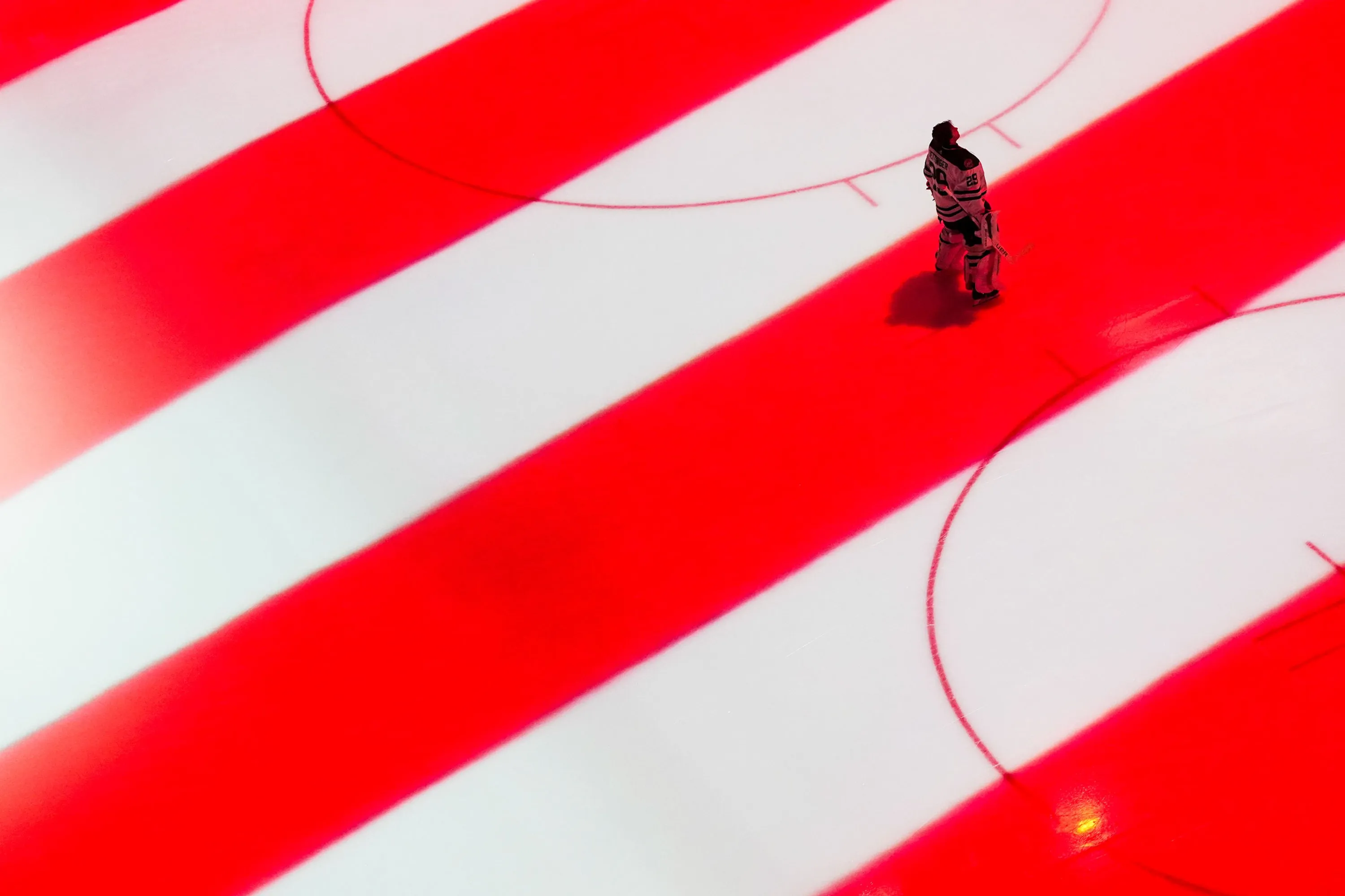 Dallas Stars goaltender Jake Oettinger stands in a projection of the American flag during the national anthem before an NHL hockey game against the Seattle Kraken, Saturday, March 30, 2024, in Seattle. (Photo by Lindsey Wasson/AP Photo)