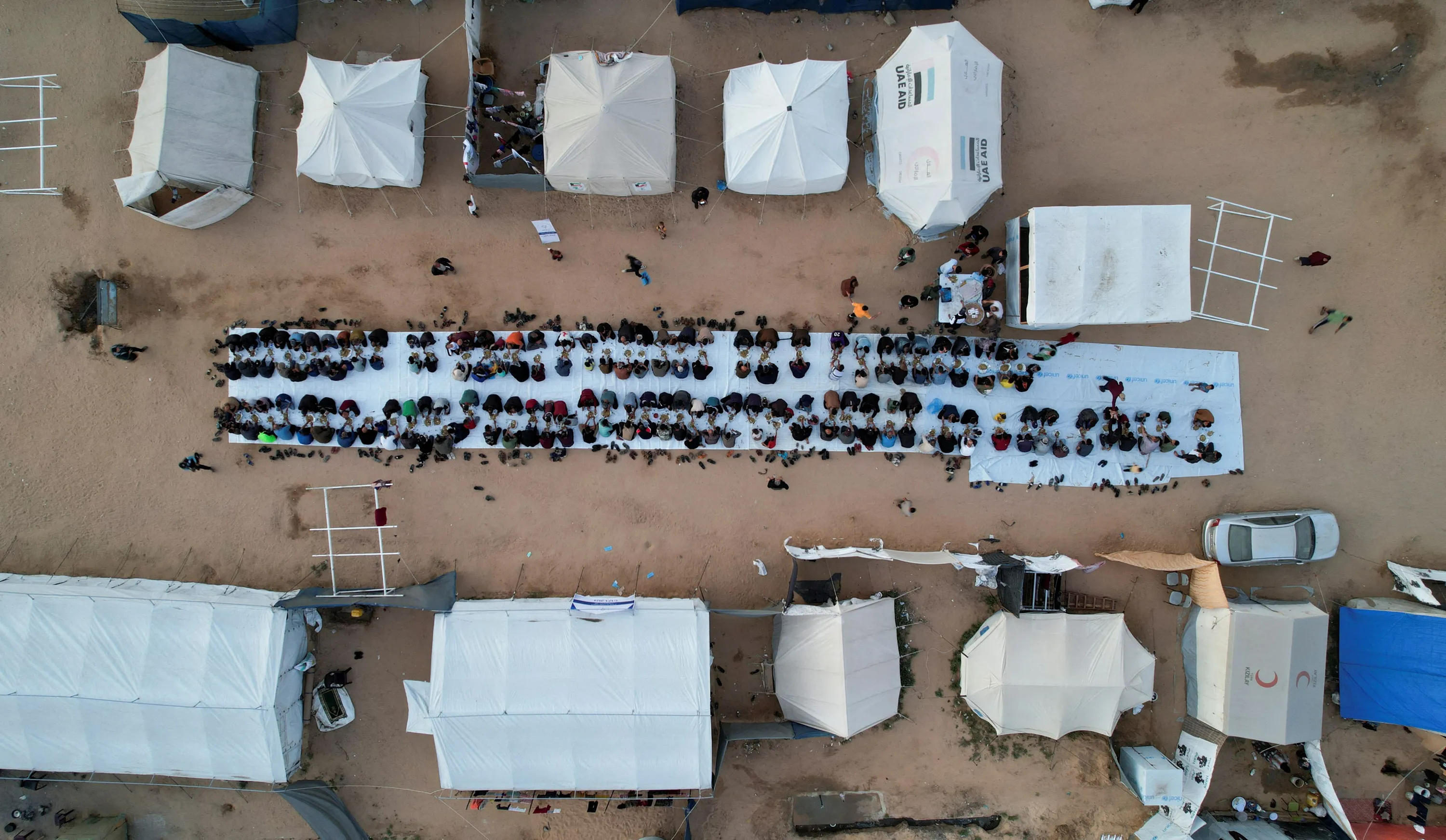 A drone view shows Palestinians, who were displaced by Israel's military offensive, gathering to have their Iftar (breaking of the fast) during the holy month of Ramadan, in Rafah in the southern Gaza Strip on April 6, 2024. (Photo by Shadi Tabatibi/Reuters)