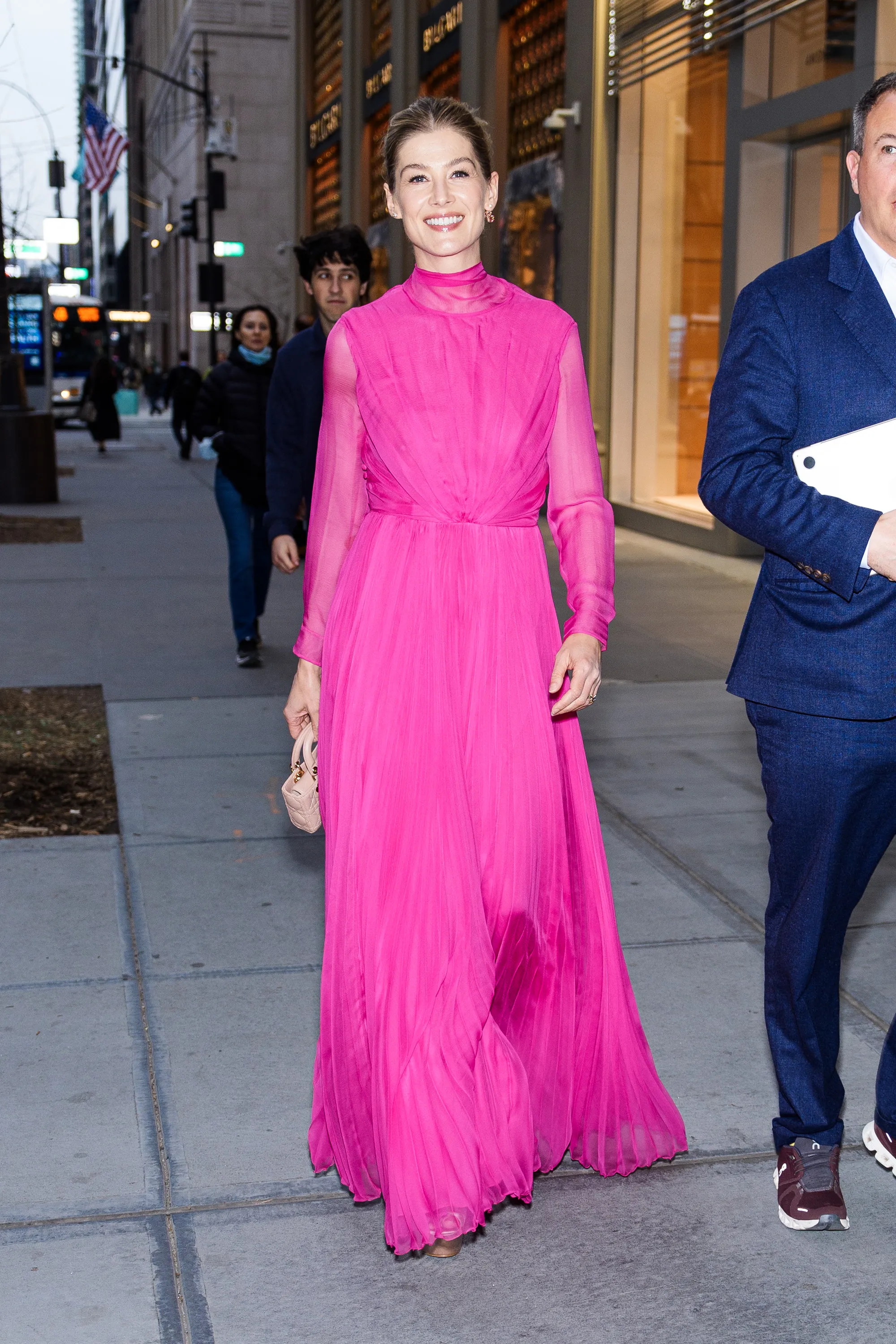 British actress Rosamund Pike is seen in Midtown on April 10, 2024 in New York City. (Photo by Gotham/GC Images)