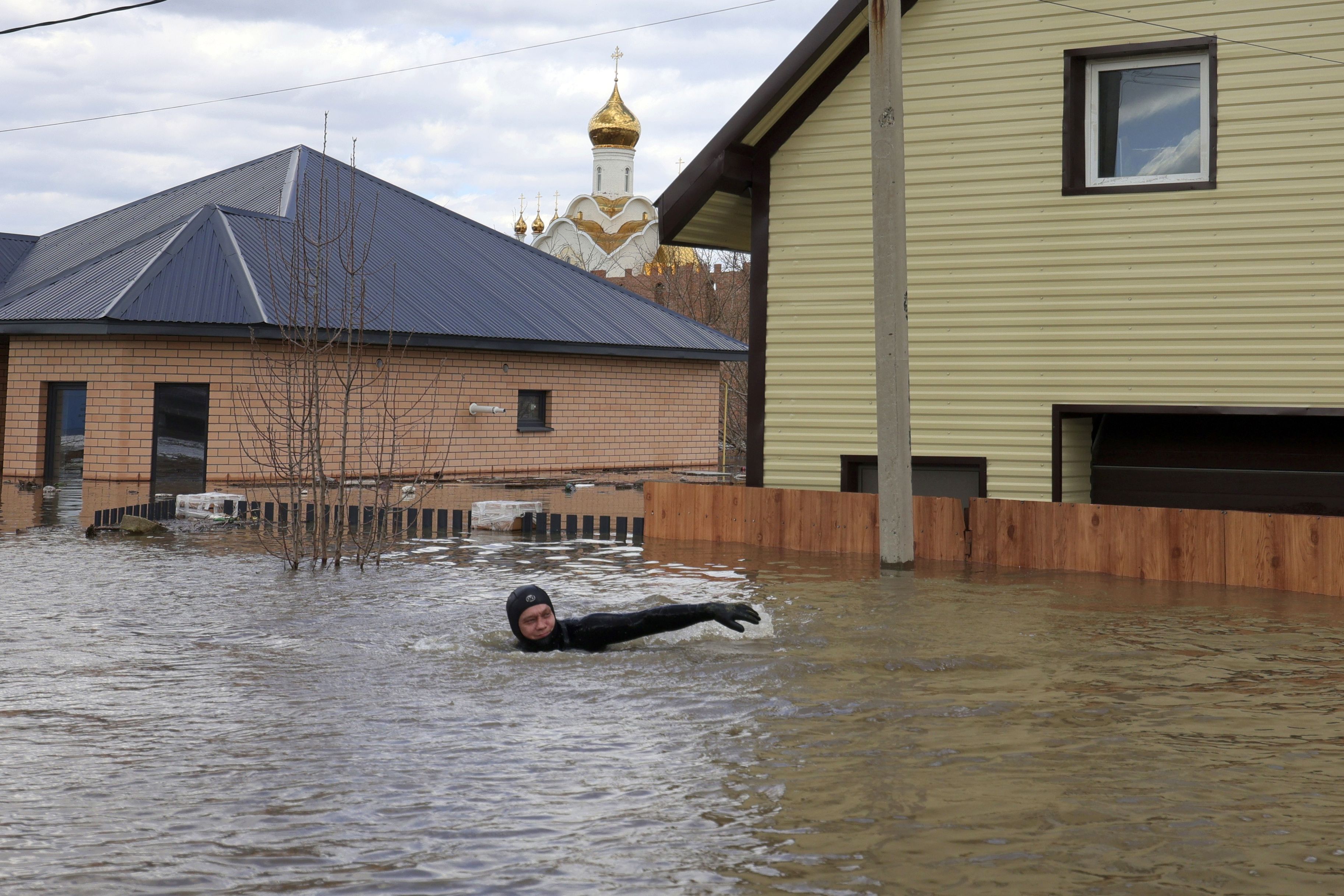 A local resident swims in the flooded street between houses in Orenburg, Russia, on Saturday, April 13, 2024. Over 11,700 houses remain flooded in the Orenburg region and some 10,700 people have already been evacuated from flooded areas. The deluge hit the region after a dam on the Ural River burst last week under surging waters. (Photo by AP Photo)