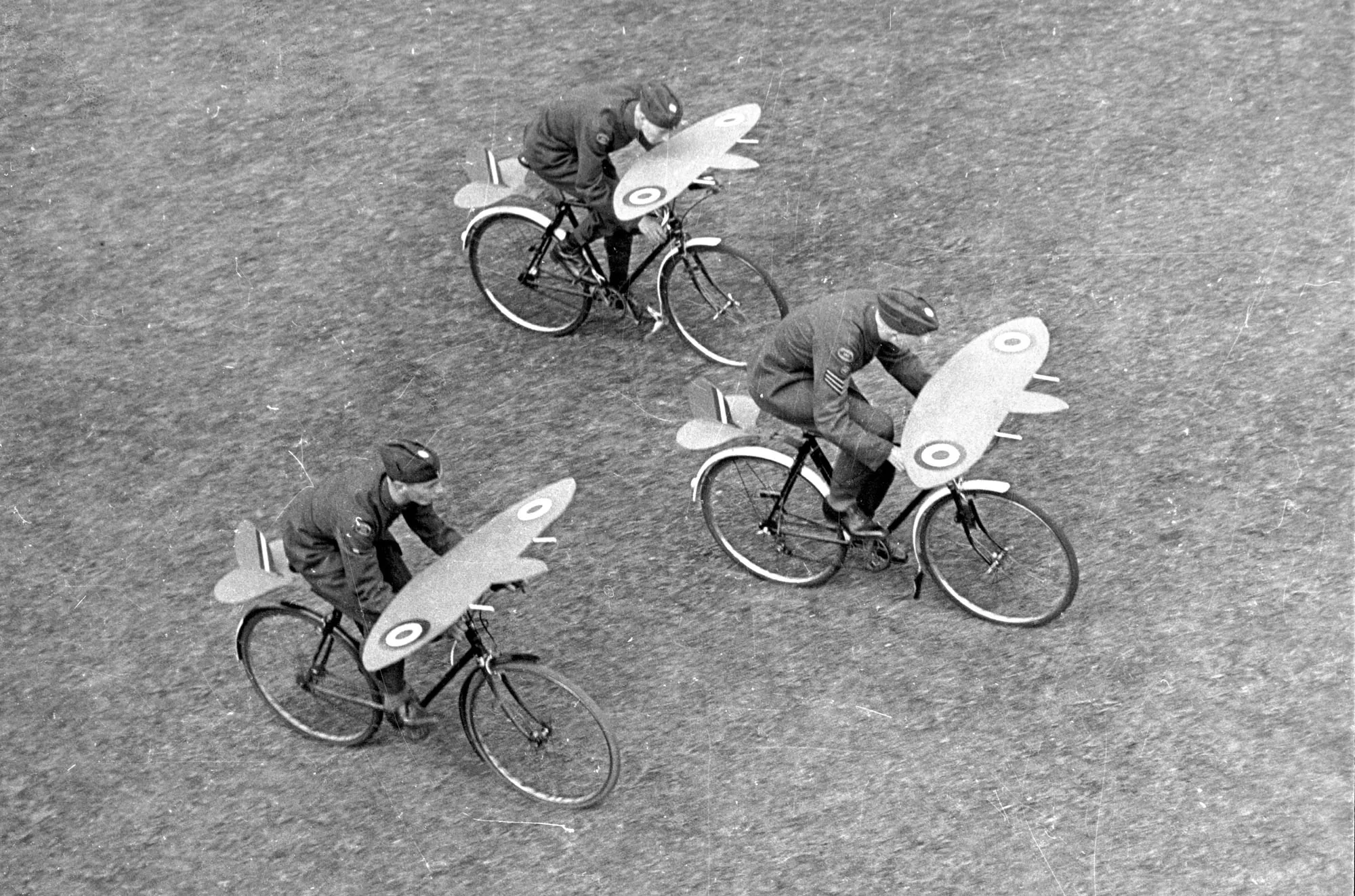 Three Air Cadets from the RAF's Coulsdon and Purley Squadron practice 'formation flying' using bicycles with wings over the handlebars, 29th September 1942. (Photo by Hulton Archive/Getty Images)