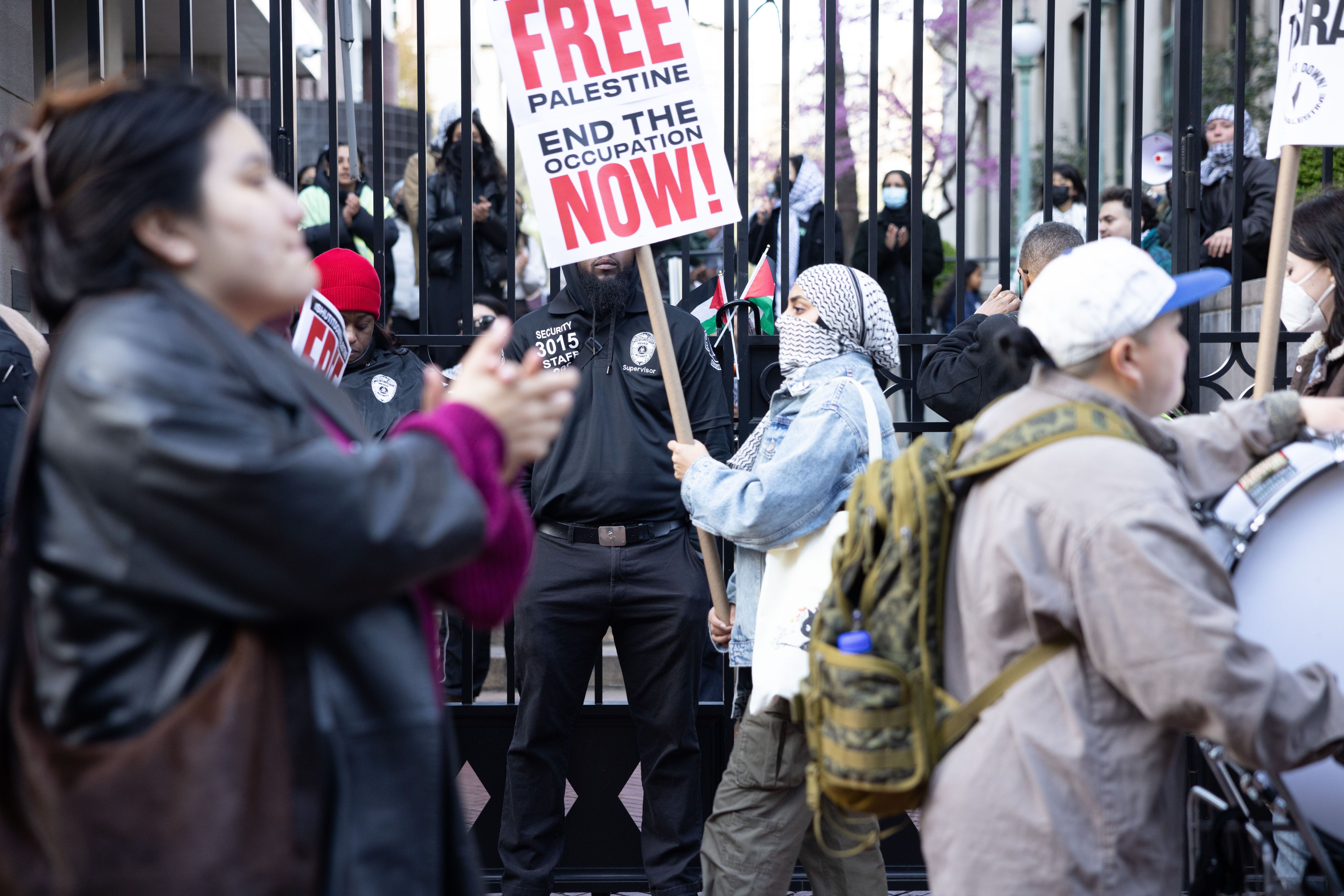 Pro-Palestine demonstrators are gathering in protest both inside and outside the locked gates of the Columbia University campus in New York City, USA, on April 23, 2024. Students who are standing on Columbia's main quad are facing the public street through the locked gate and are using megaphones to lead the crowd assembled outside in chants. Campus security has been tight since the ''Gaza Solidarity Encampment'' protest standoff began a week ago. Since only those with university ID--and members of the media during certain hours of the day--are allowed on campus, additional groups of protesters from outside the Columbia community are often forming on the public streets next to the main quad. Tensions remain high days after Columbia University President Nemat ''Minouche'' Shafik called the NYPD onto the college campus on April 18, 2024, to arrest scores of pro-Palestine students who refused to dismantle protest encampments on the main campus quad. The standoff and arrests occurred after President Shafik had faced questions before Congress regarding campus antisemitism and enforcement of rules against protests. The demonstrators are demanding divestment from Israel amid the ongoing Israel-Gaza War. (Photo by Melissa Bender/NurPhoto/Rex Features/Shutterstock)