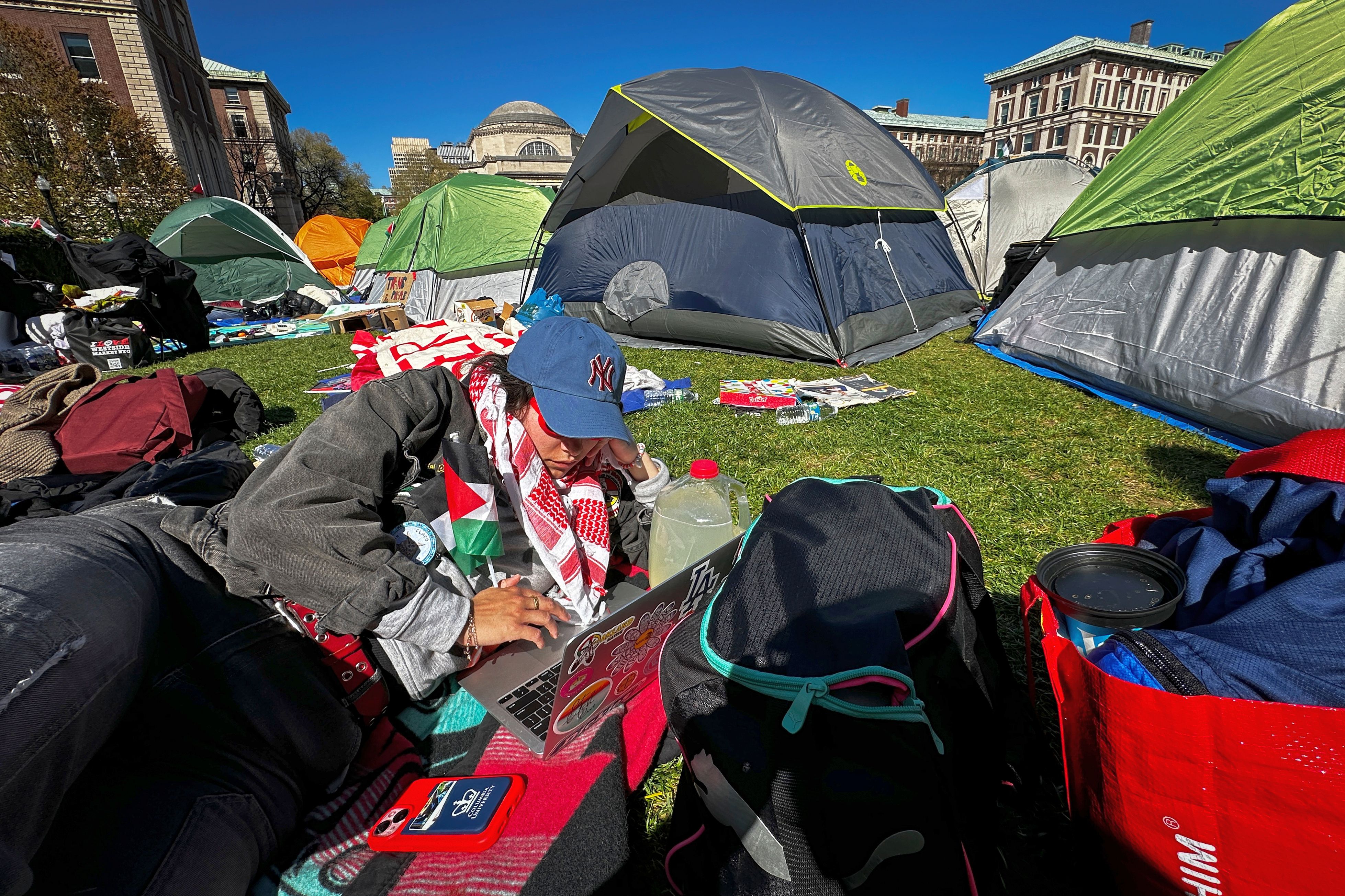 A pro-Palestinian demonstrator uses their computer at a protest encampment at the Columbia University campus, Monday, April 22, 2024, in New York. (Photo by John Minchillo/AP Photo)
