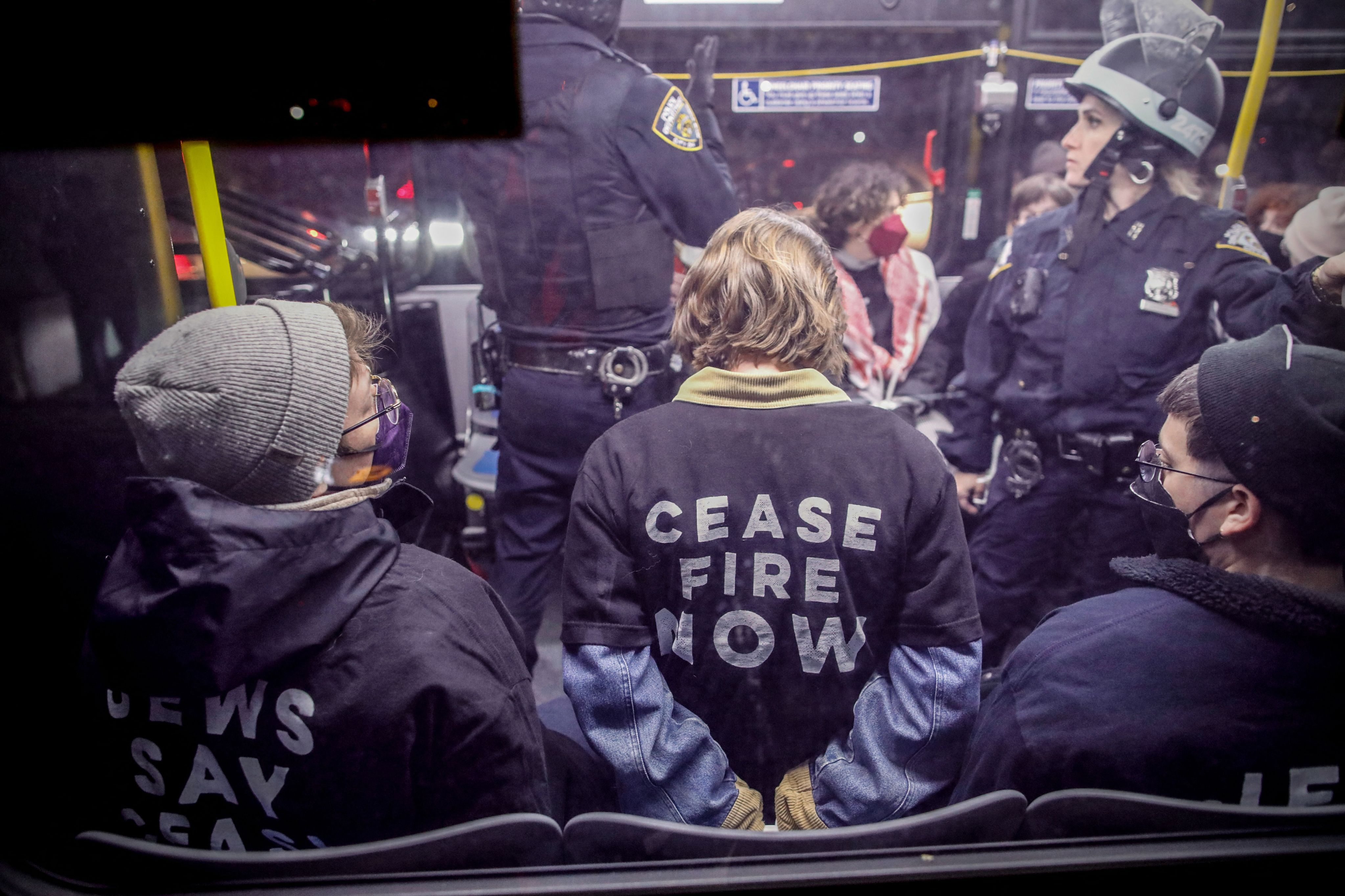 Police officers arrest protestors near the home of US Senate Majority Leader Chuck Schumer in the Brooklyn borough of New York during a demonstration by pro-Palestinian Jewish groups on the second night of Passover calling on Schumer to stop arming Israel amid its retaliatory assault on the Gaza Strip on April 23, 2024. (Photo by Kena Betancur/AFP Photo)
