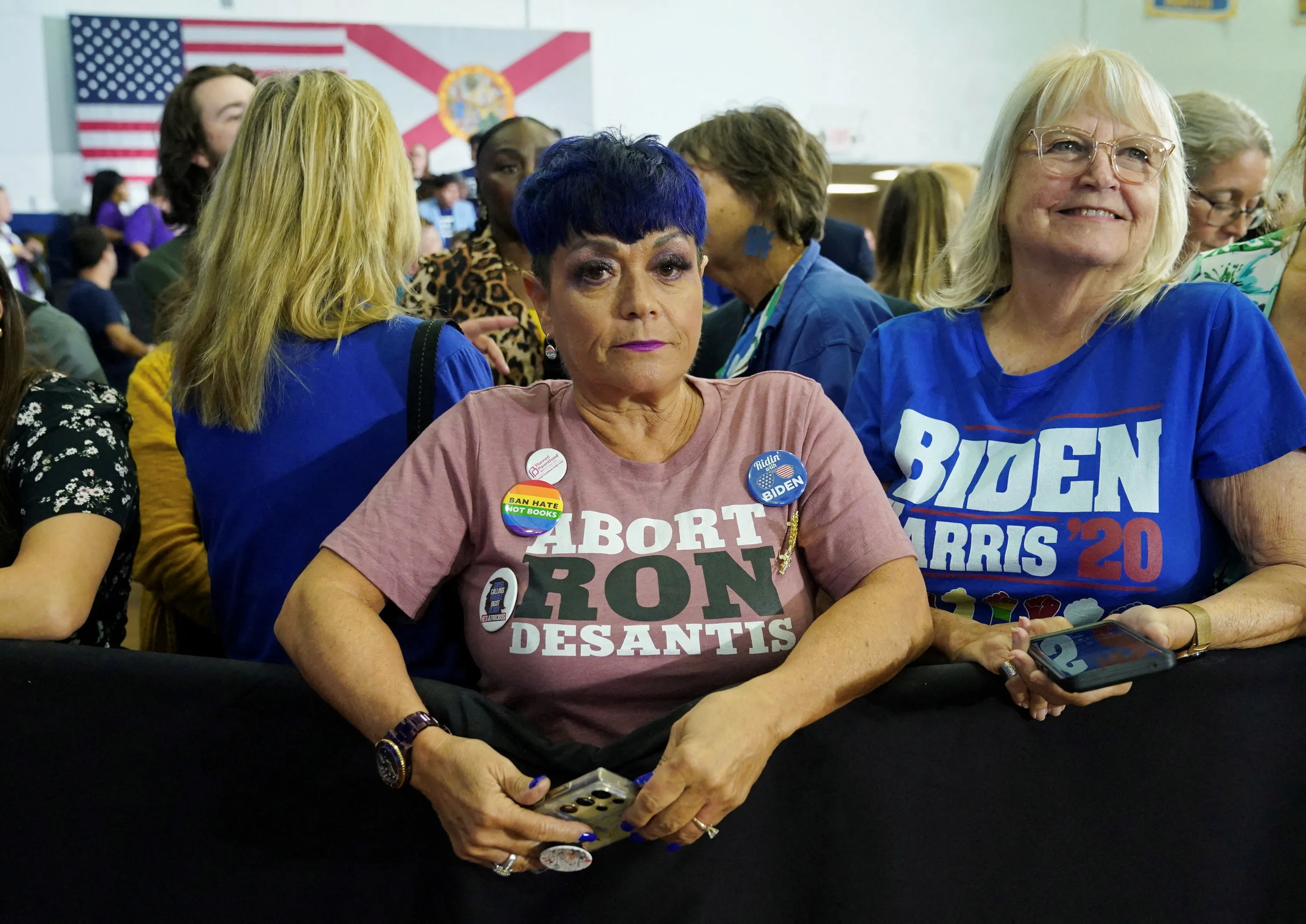 A woman wearing a T-shirt referencing Republican Florida Governor Ron DeSantis awaits the arrival of U.S. President Joe Biden to speak about abortion rights at Hillsborough Community College’s Dale Mabry campus in Tampa, Florida, April 23, 2024. (Photo by Kevin Lamarque/Reuters)