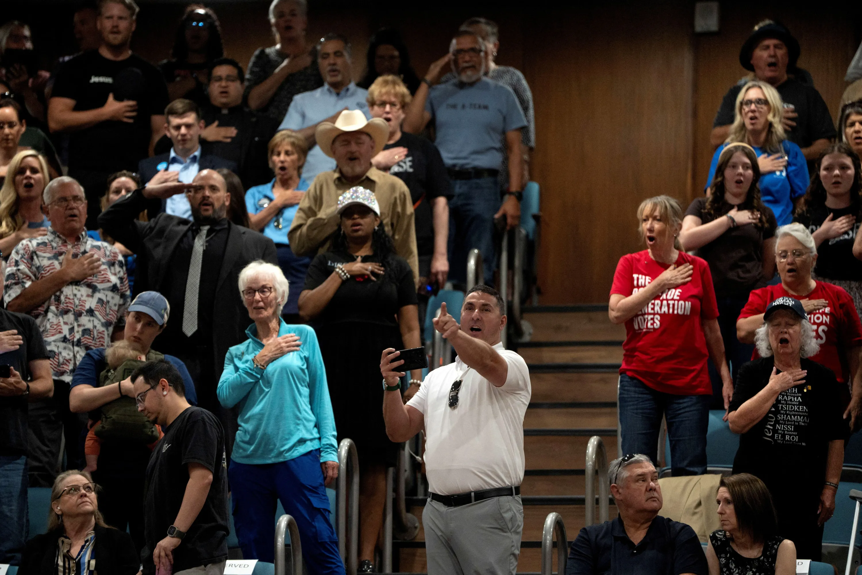 Members of the gallery say the pledge of allegiance before the Arizona State Legislature House Democrats try again to repeal an 1864 law that bans nearly all abortions, during a session in the state legislature in Phoenix, Arizona, U.S. on April 24, 2024. (Photo by Rebecca Noble/Reuters)