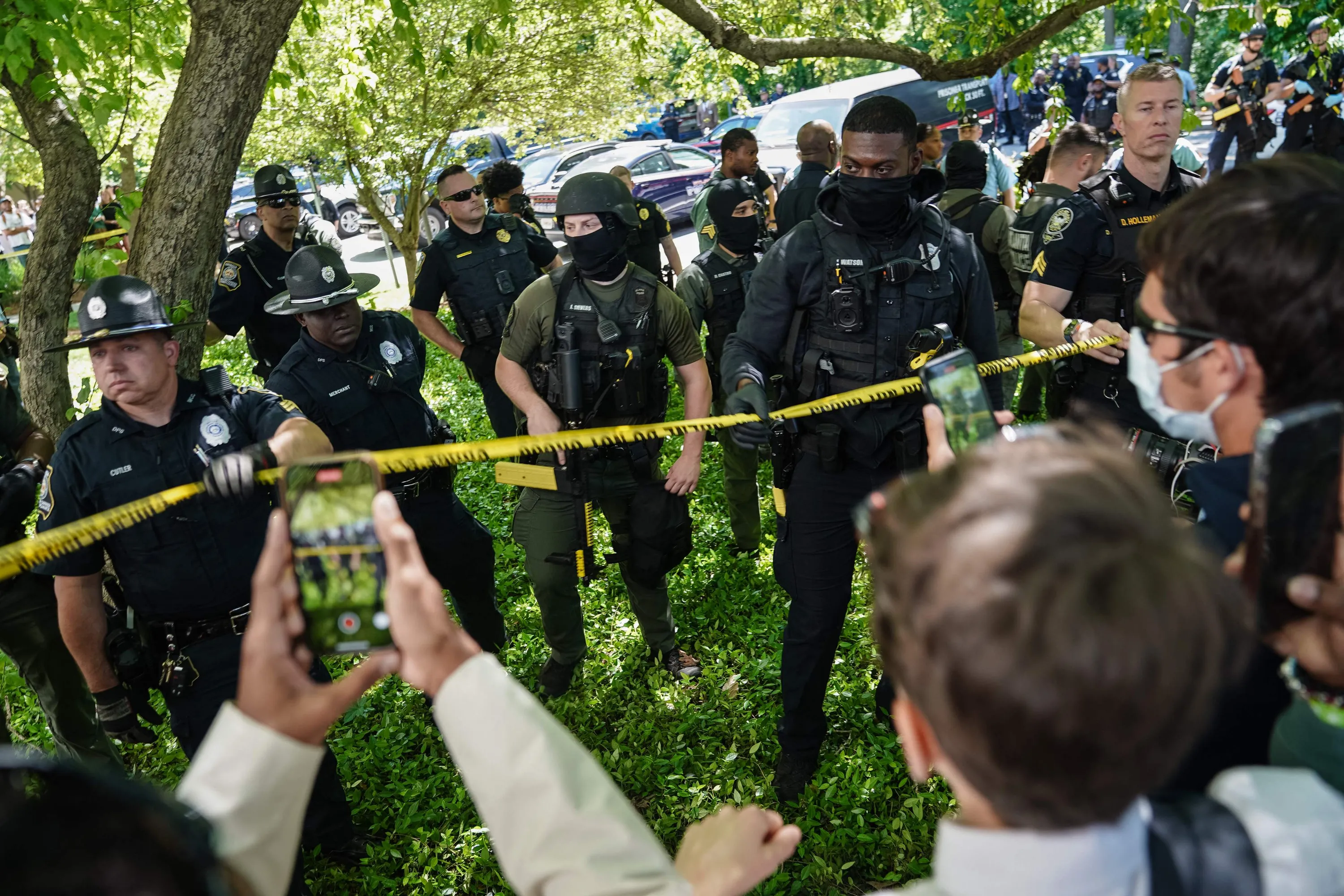 Pro-Palestinian activists confront police officers during a demonstration at Emory University on April 25, 2024, in Atlanta, Georgia. (Photo by Elijah Nouvelage/AFP Photo)