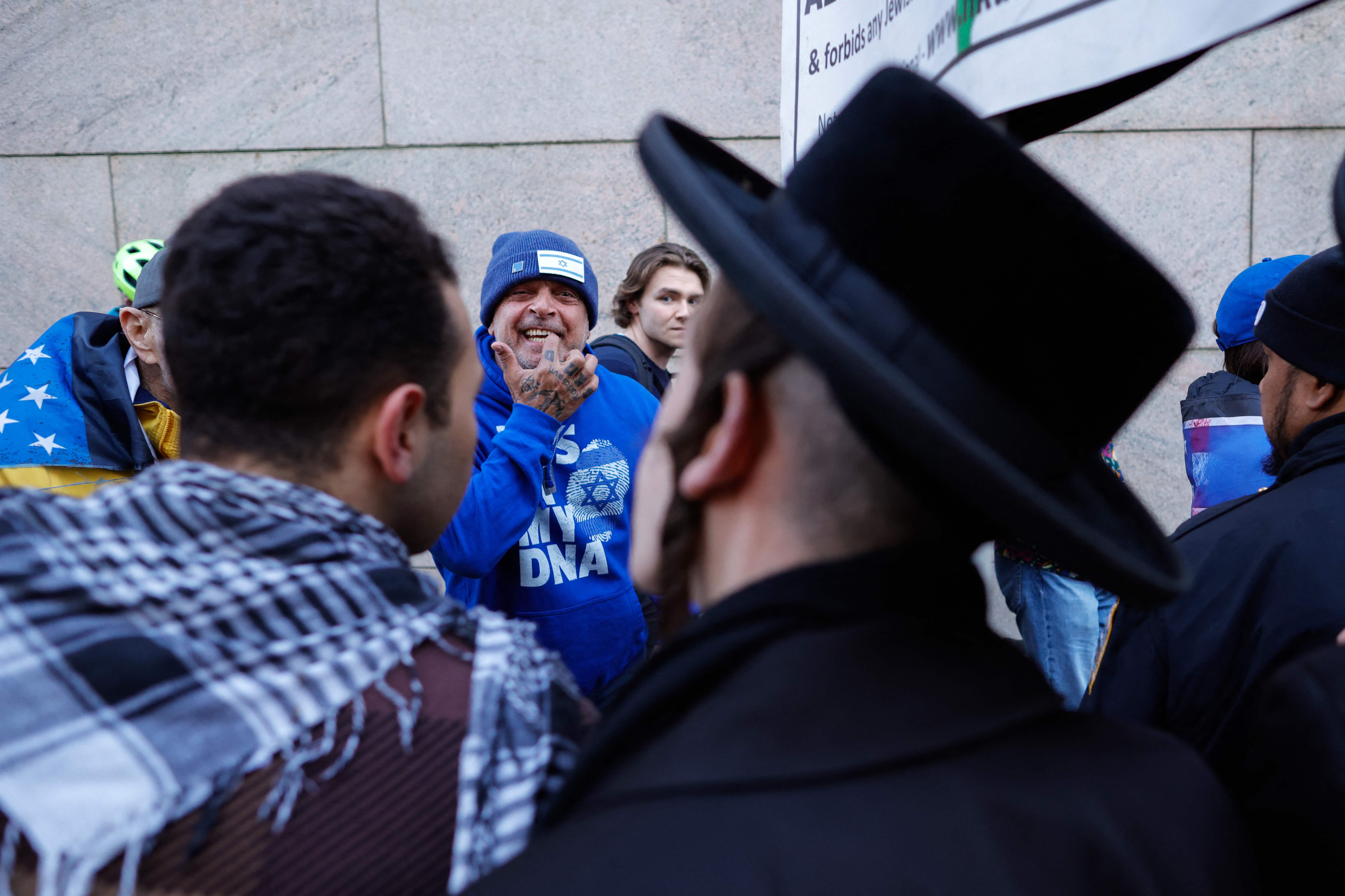 Supporters of Israel (back) argue with pro-Palestinian Orthodox Jewish men as they demonstrate outside Columbia University while pro-Palestinian protests continue on the campus in New York on April 25, 2024. Tensions flared between pro-Palestinian student protesters and school administrators at several US universities on April 22, as in-person classes were cancelled and demonstrators arrested. (Photo by Kena Betancur/AFP Photo)