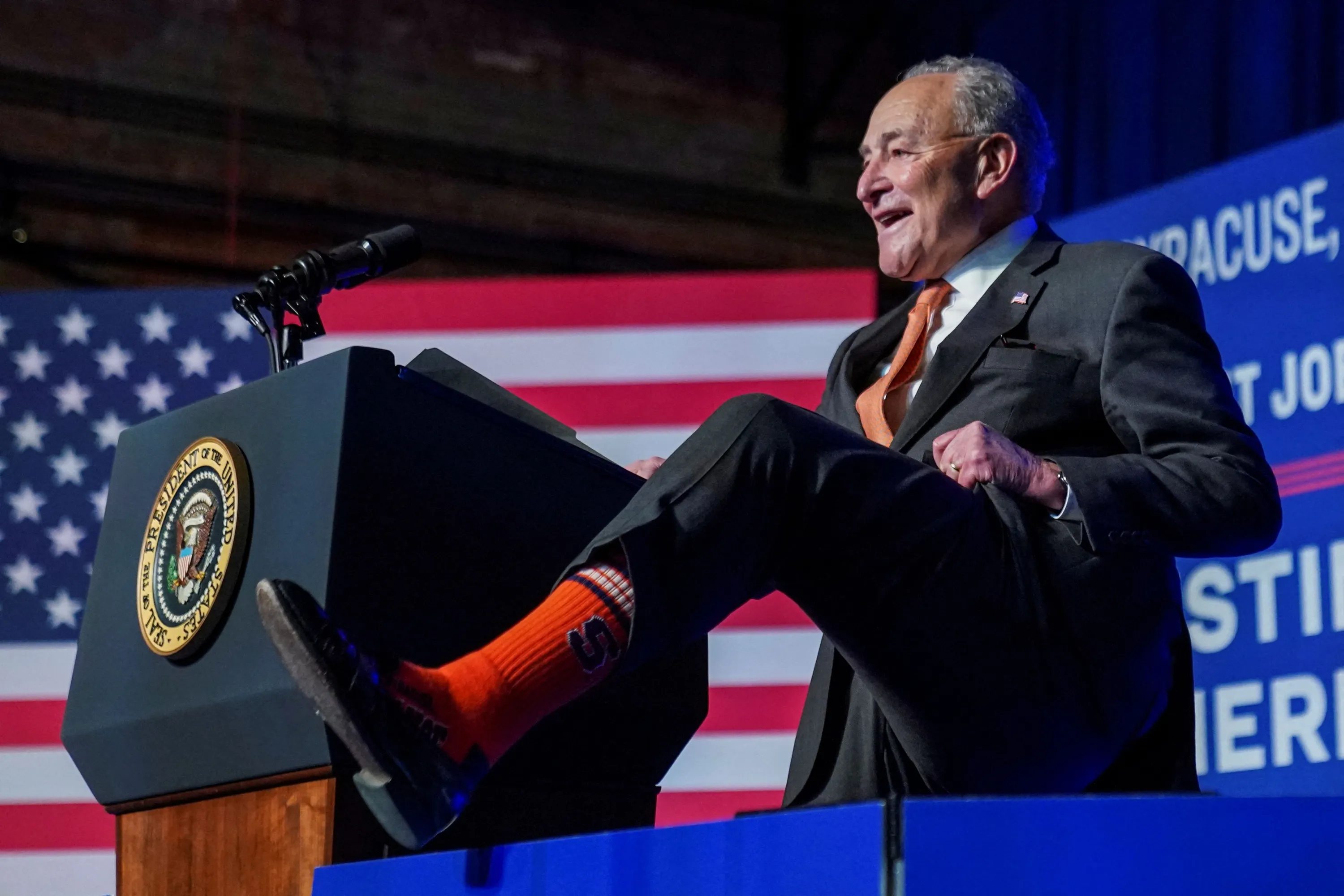 U.S. Senate Majority Leader Chuck Schumer (D-NY) shows off his Syracuse University orange socks at the Milton J. Rubenstein Museum of Science and Technology, in Syracuse, New York, on April 25, 2024. (Photo by Kevin Lamarque/Reuters)
