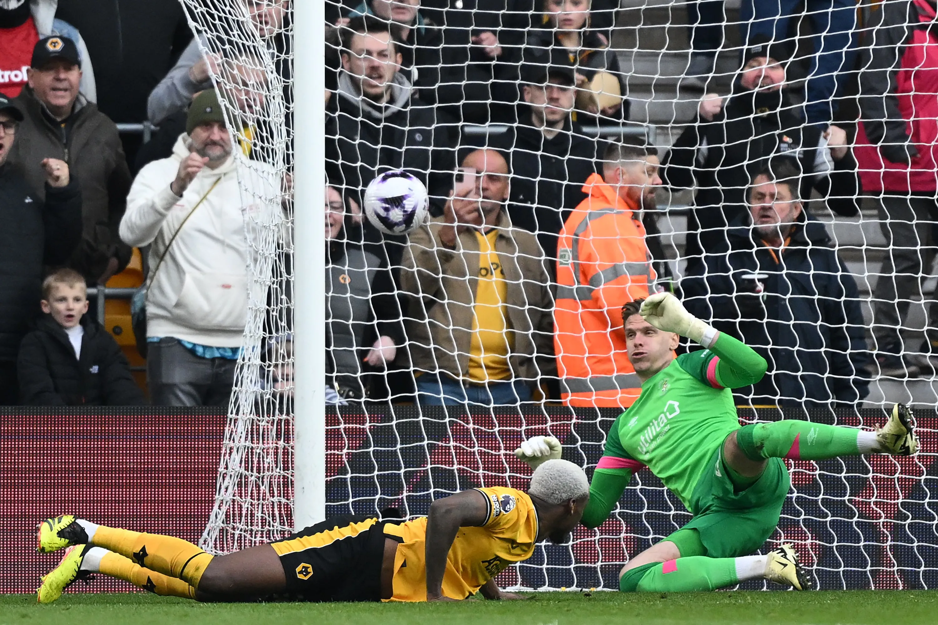 Wolverhampton Wanderers' Portuguese defender #24 Tote Gomes (L) heads past Luton Town's Belgian goalkeeper #24 Thomas Kaminski (R) for their second goal during the English Premier League football match between Wolverhampton Wanderers and Luton Town at the Molineux stadium in Wolverhampton, central England on April 27, 2024. (Photo by Justin Tallis/AFP Photo)