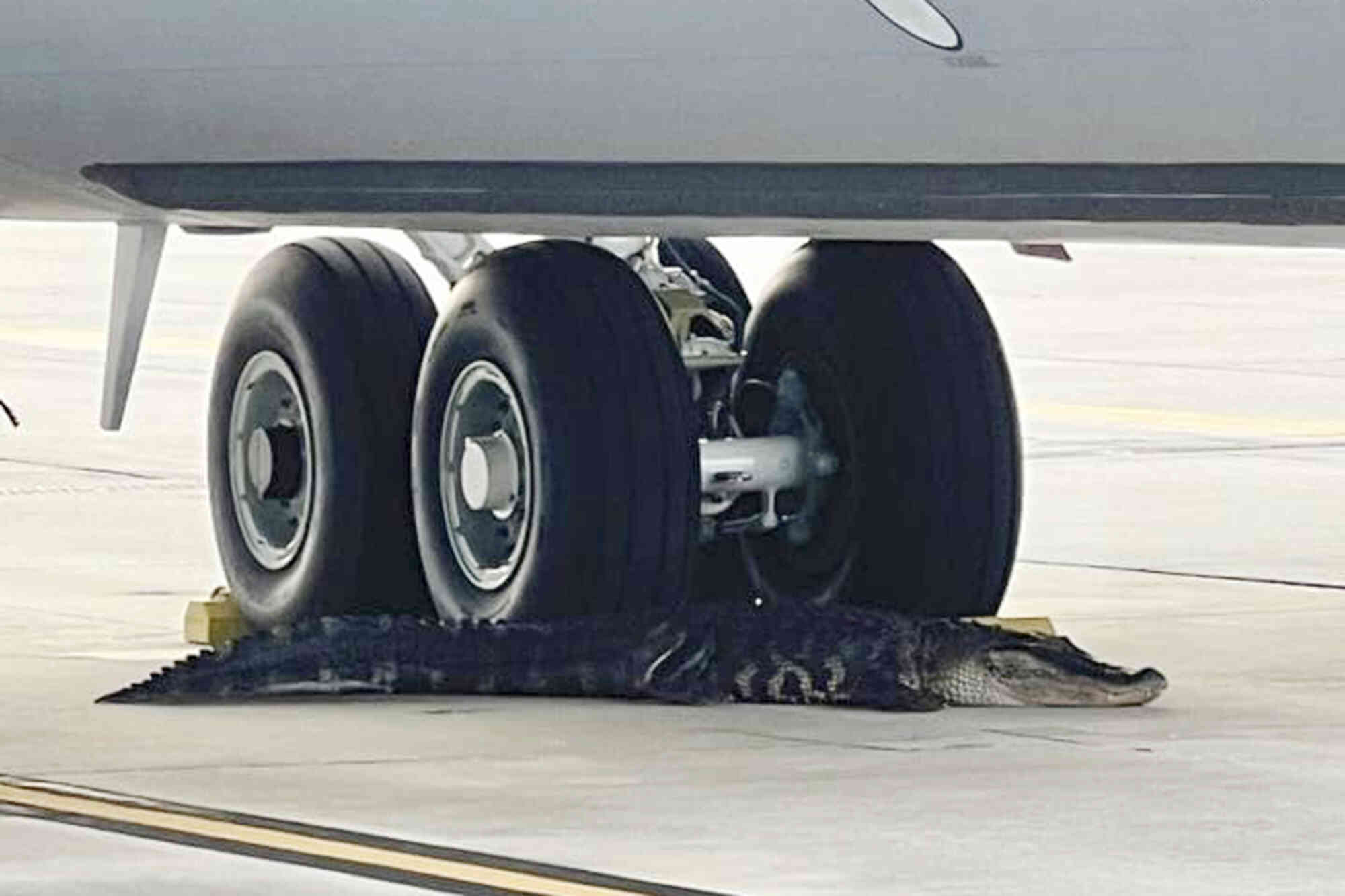 In this photo released by the MacDill Air Force Base, an alligator rests at the landing gear of a KC-135 aerial refueling aircraft on the runway of MacDill Air Force Base in Tampa, on Monday, April 22, 2024. Officers with the Florida Fish and Wildlife Conservation Commission responded and the alligator was moved and released in a nearby river. (Photo by MacDill Air Force Base via AP Photo)