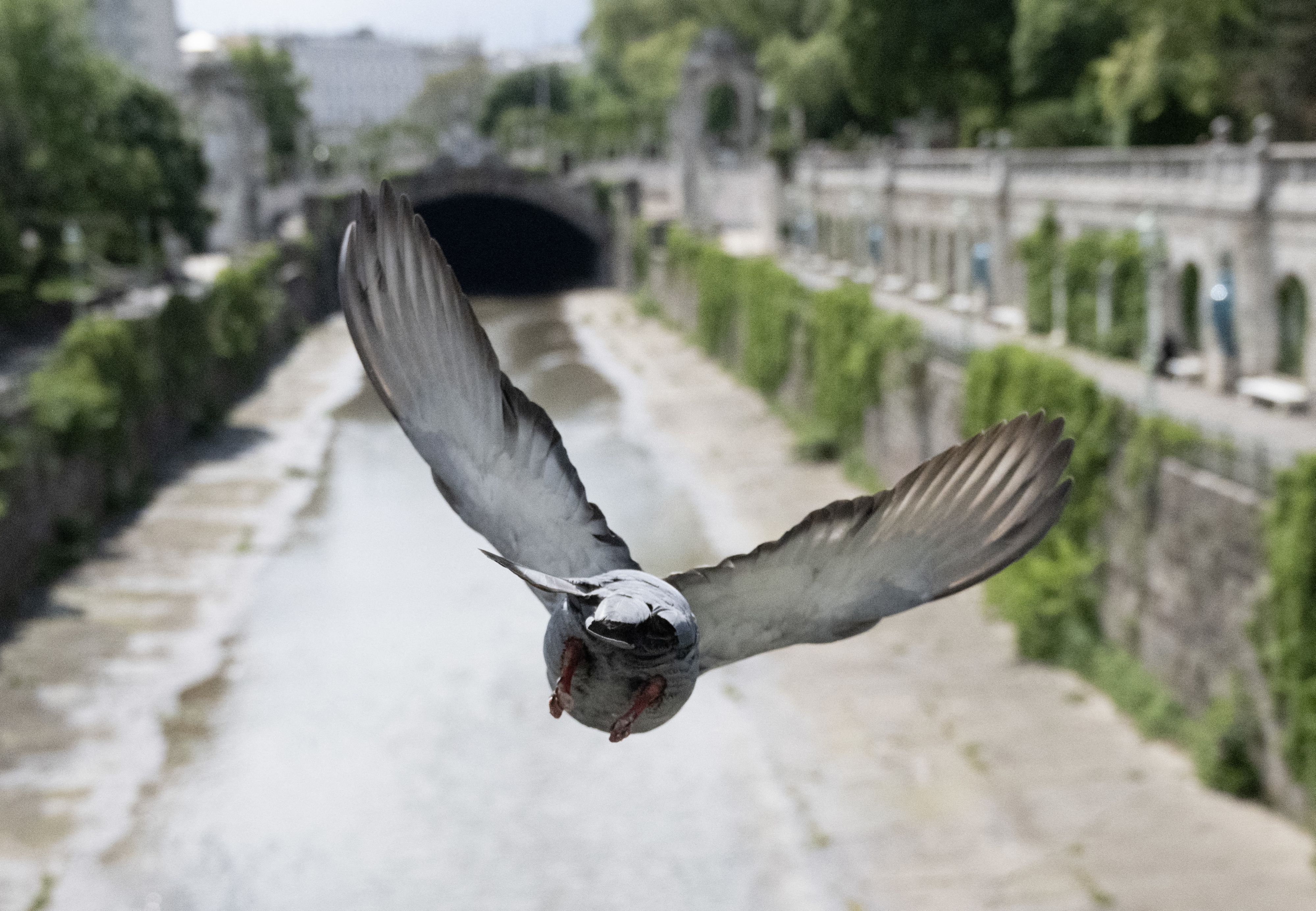 A pigeon flies over the canal of Wienfluss (Vienna's river) at the City Park in Vienna, Austria on April 17, 2024. (Photo by Joe Klamar/AFP Photo)