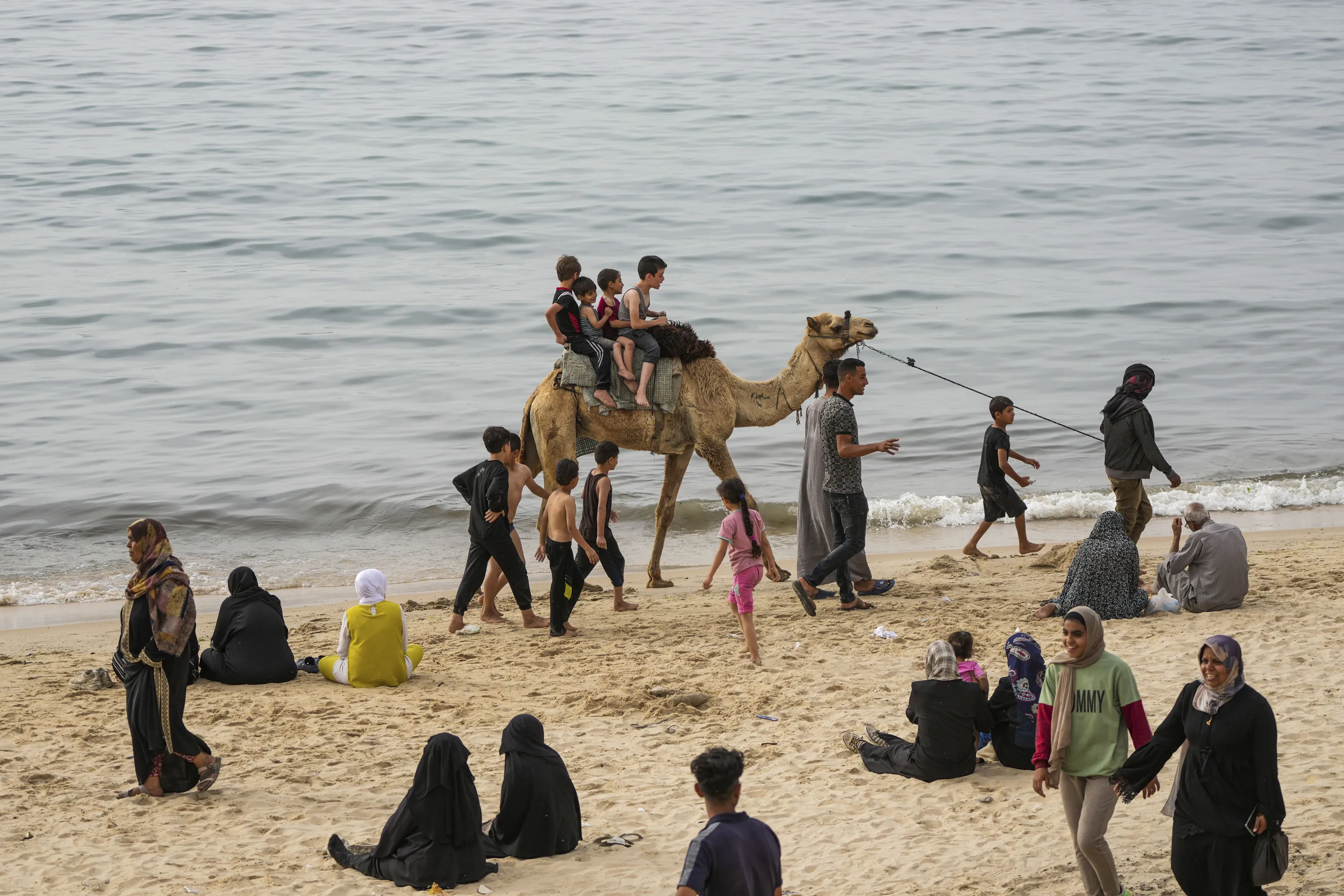Palestinians who have been displaced by the ongoing war with Israel, spend the day on the beach along the Mediterranean Sea in Deir al Balah, Gaza Strip, April 25, 2024. (Photo by Abdel Kareem Hana/AP Photo)