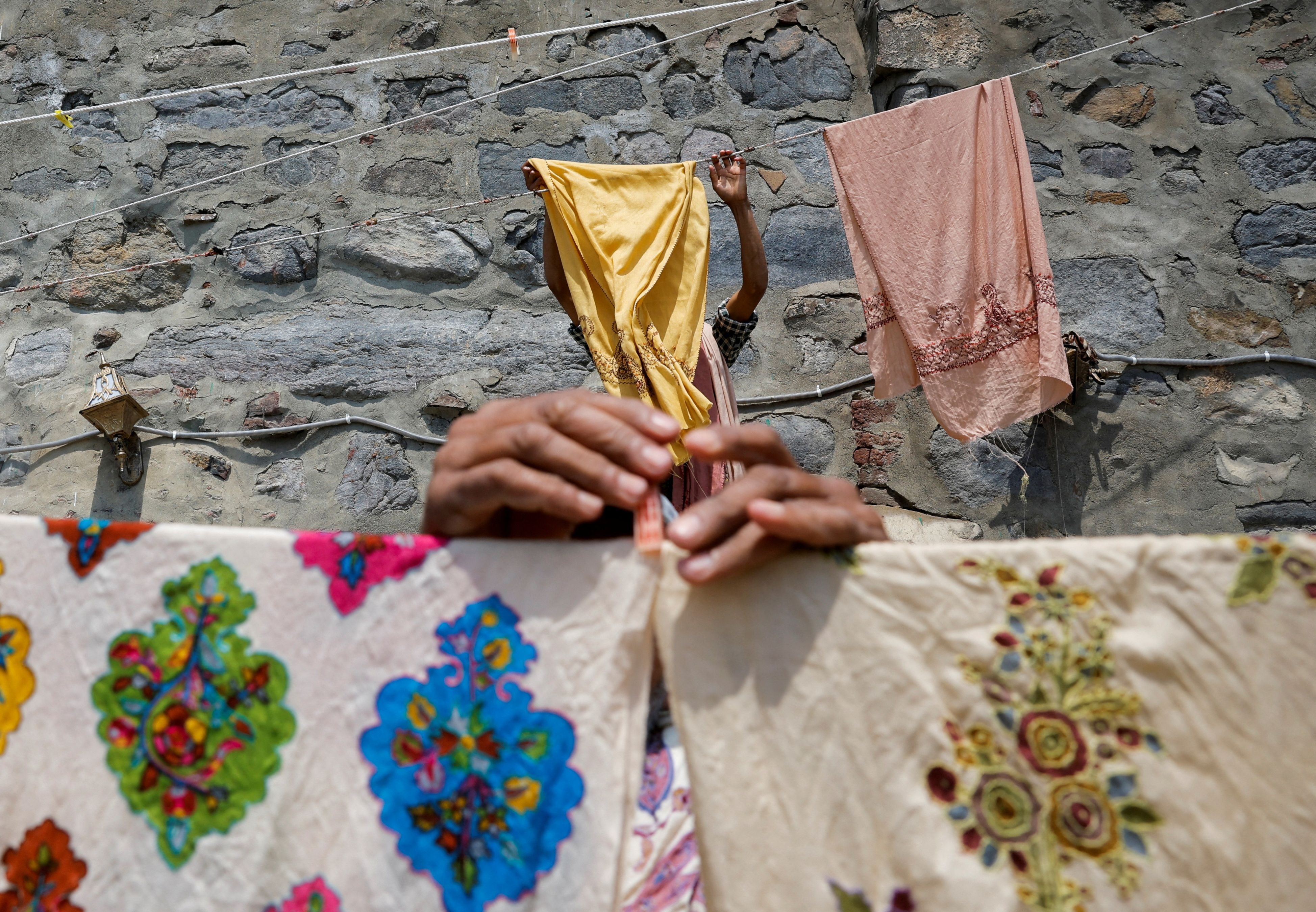 Washermen leave embroidered shawls to dry in the sun, on the banks of river Jhelum, in Srinagar on April 24, 2024. (Photo by Sharafat Ali/Reuters)