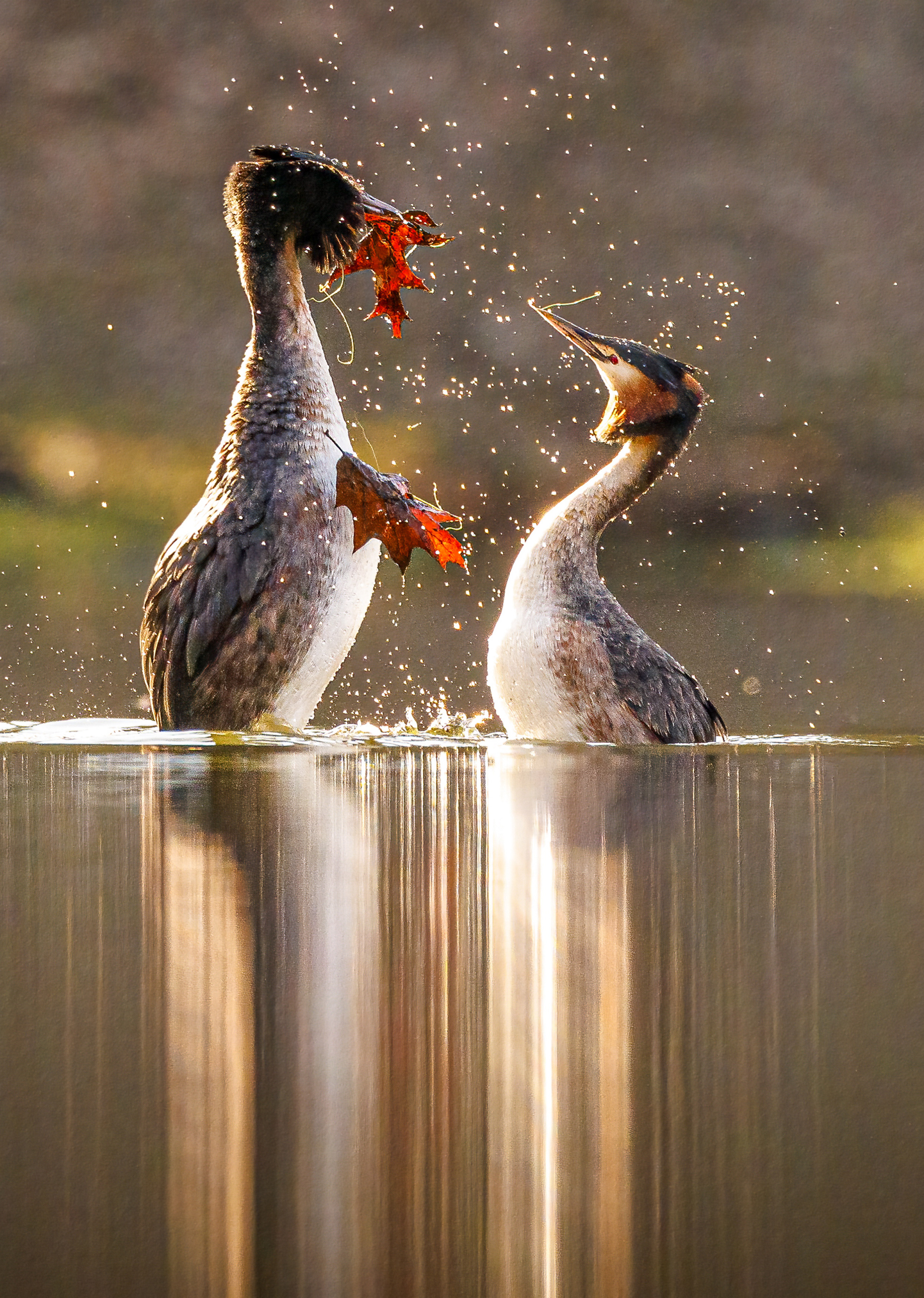 A pair of great crested grebes in the last decade of April 2024 perform a courtship ritual in Katowice, Poland, which involves presenting each other with leaves and plant material. (Photo by Patrick Kurc/Solent News)