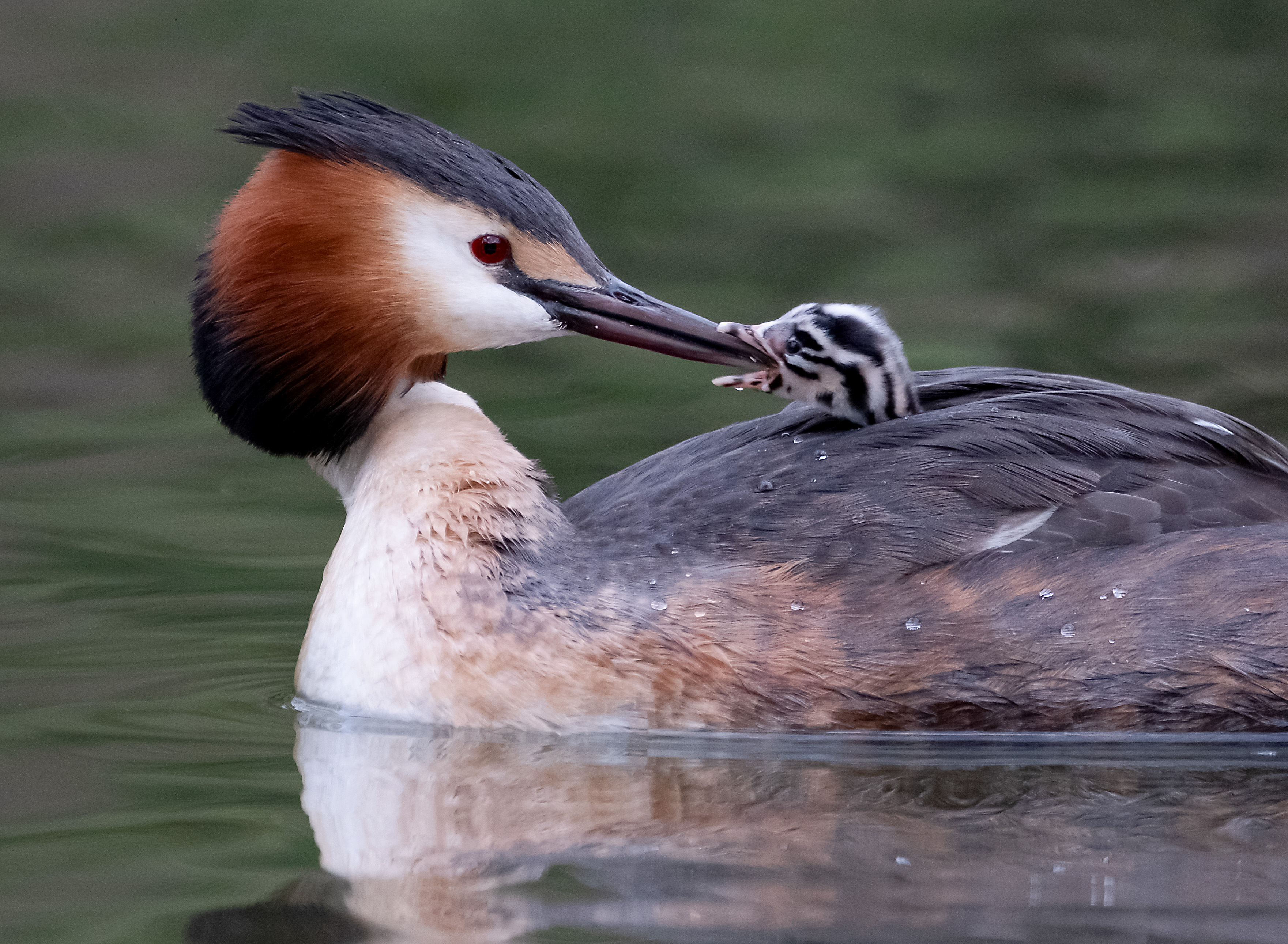 A grebe chick also known as a humbug due to its feather pattern is fed by its parent at Regent's Park in London on Thursday, April 25, 2024. (Photo by Alister Gooding/Picture Exclusive)