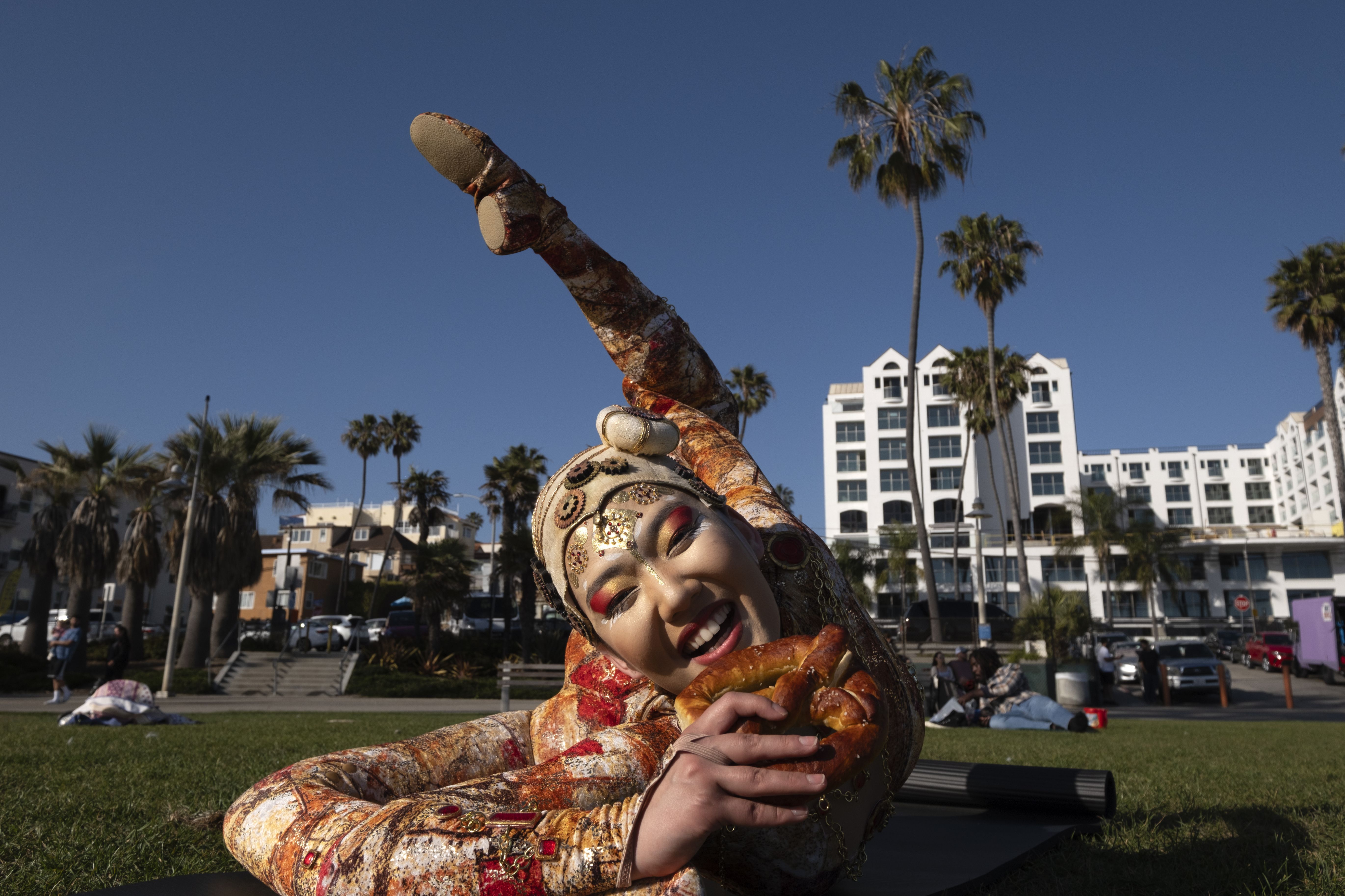 Cirque du Soleil contortionist Sender Enkhtur takes a bite on a pretzel as she poses for a photo at Santa Monica Beach, Monday, April 29, 2024, in Santa Monica, Calif. Cirque du Soleil announced their return to the Santa Monica Pier this fall after being gone for over a decade. (Photo by Richard Vogel/AP Photo)