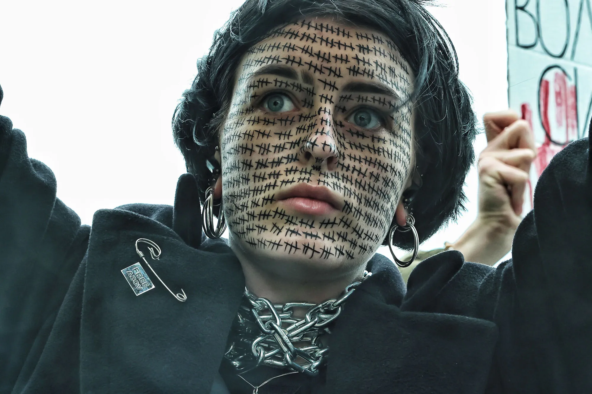 An activist with a painted face symbolizing the count of days spent in captivity attends the Free Azov rally in support of the captured defenders of Mariupol on April 21, 2024 in Kyiv, Ukraine. The participants came out to remind about the Ukrainian soldiers who have been held in Russian captivity for more than two years. (Photo by Yan Dobronosov/Global Images Ukraine via Getty Images)