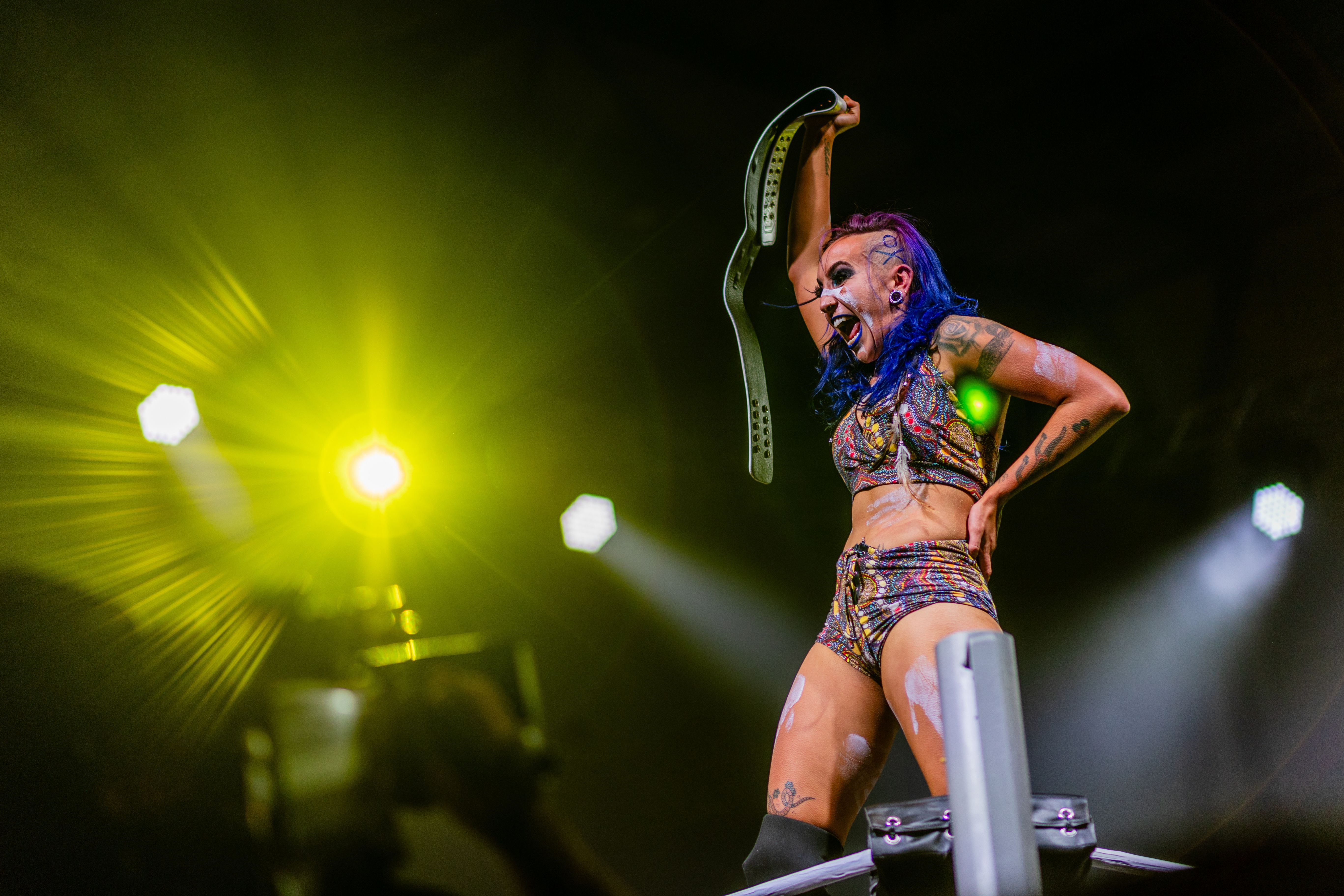 Pro wrestler Erika Reid aka “The Dreamtime Voodoo Witch” holds aloft her winner’s belt after defeating Lizzy Evo in the Oceania pro wrestler women’s championship in Selkirk Stadium in Ballarat, Australia on 12 April, 2024. (Photo by Steve Womersley/The Guardian)